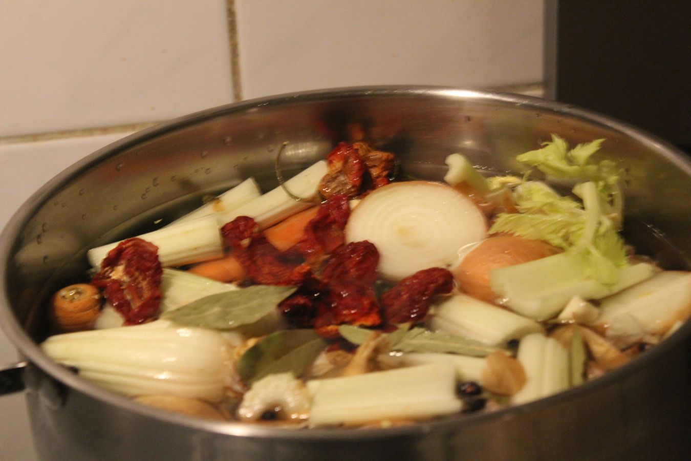 Dann den Topf mit kaltem Wasser auffüllen. Bei mir waren das noch neun Liter. Die größte Herdplatte auf mittlerer Hitze hochfahren lassen. Deckel auf den Topf legen, damit die Flüssigkeit nicht verkocht. Wenn die Brühe ein Mal gekocht hat, auf die kleinste Herdplatte um ziehen und so niedrig einstellen, dass die Brühe nur ganz leicht vor sich hinsimmert.
