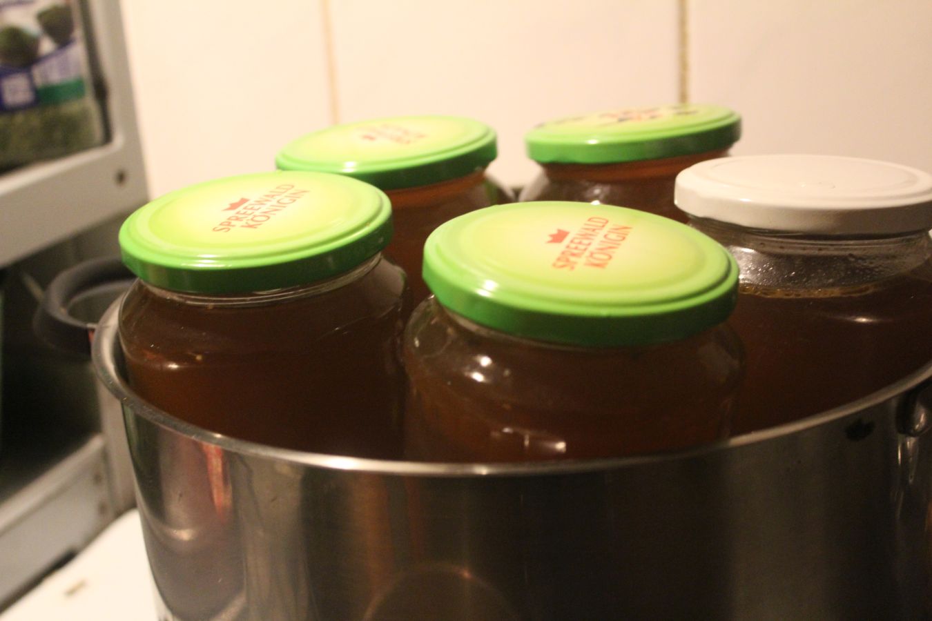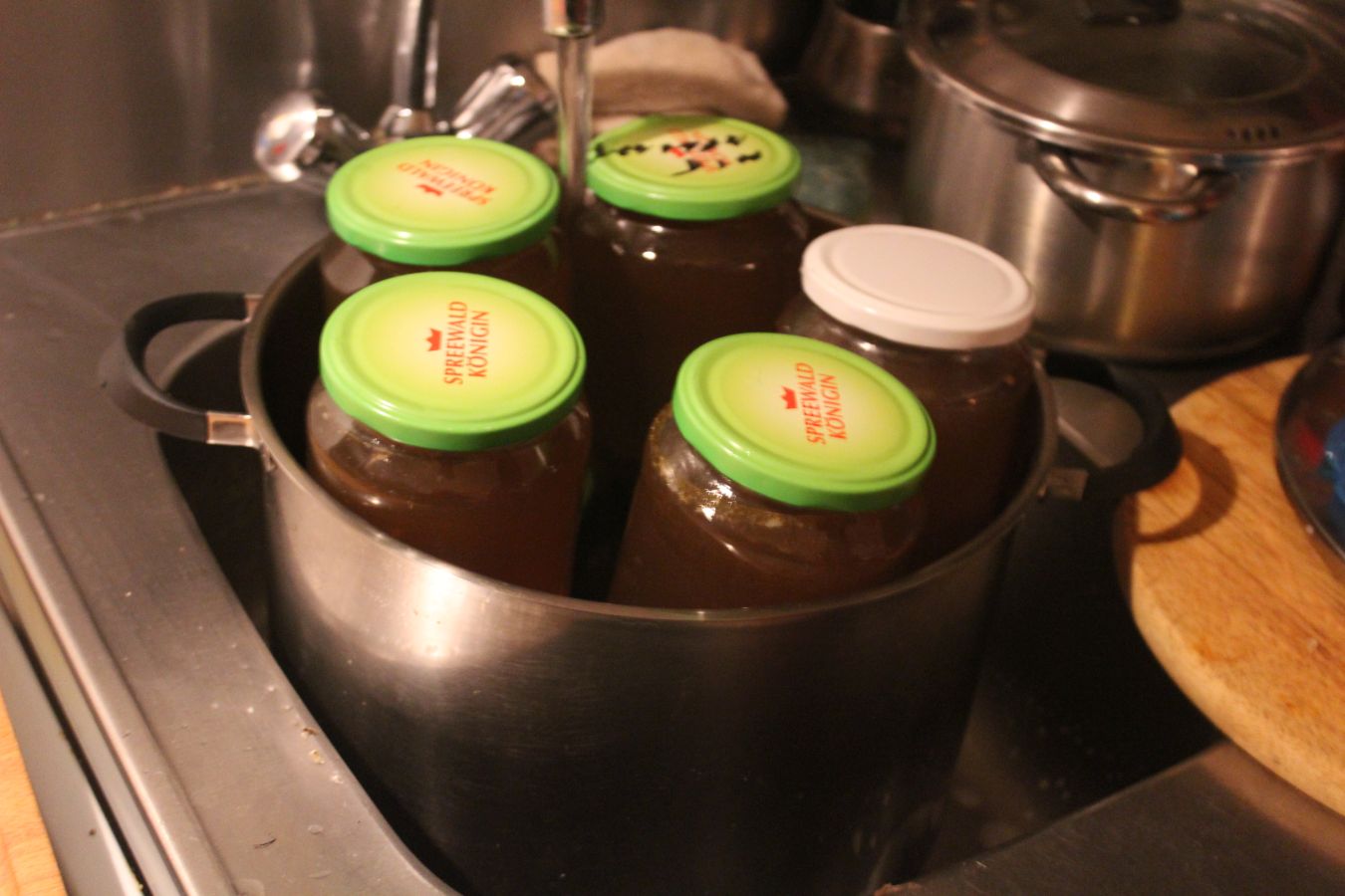 Brühe ist jetzt in Schraubgläser umgefüllt und muss noch eingekocht werden, damit sie haltbar wird.