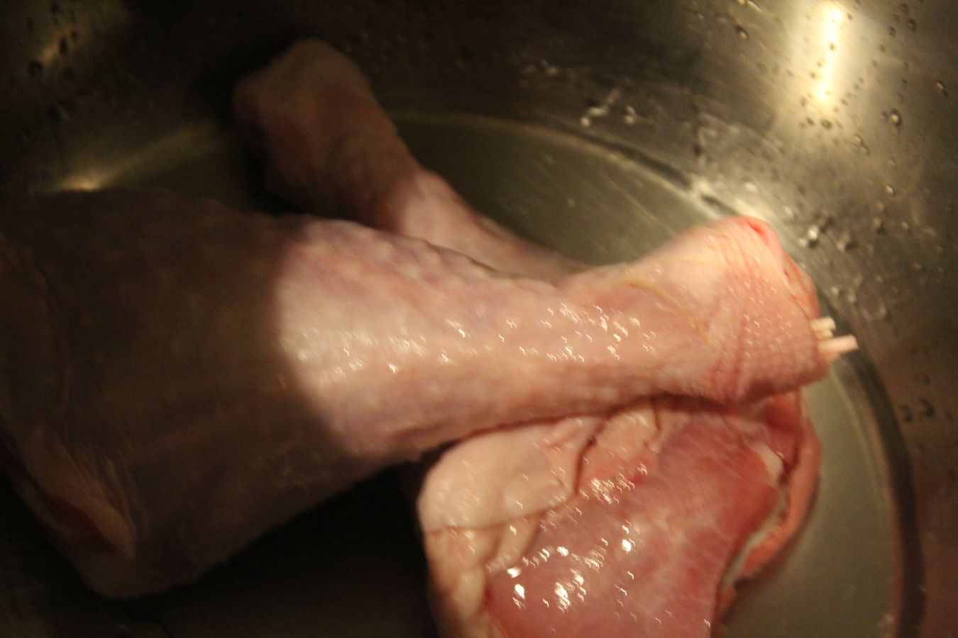 Die gab es bis jetzt auch noch nicht bei mir. Meiner Idee folgend, dass man aus allem Brühe machen kann, kommt jetzt auch mal eine Pute zu ihrem Recht. Putenkeulen sind einfaches und günstiges Fleisch. Ich hatte ein bisschen zu viel eingekauft und meine Frau fängt nach ein paar Tagen Fleisch am Stück, immer irgendwie an zu murren. Deswegen koche ich dann daraus Brühe, damit nichts umkommt. Brühe läuft bei mir zuhause literweise durch. Davon kann ich nie genug haben, als Basis für Suppen und Soßen, als Erkältungsmedizin, als schnellen Energiedrink zwischendurch. Durch die Knochen, gibt das auch eine schöne kräftige Brühe.