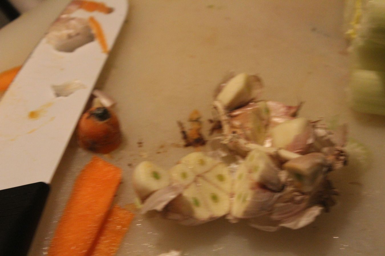 Zwiebeln halbieren. Die Schalben bleiben dran, weil das der Brühe eine goldene Farbe verleiht.