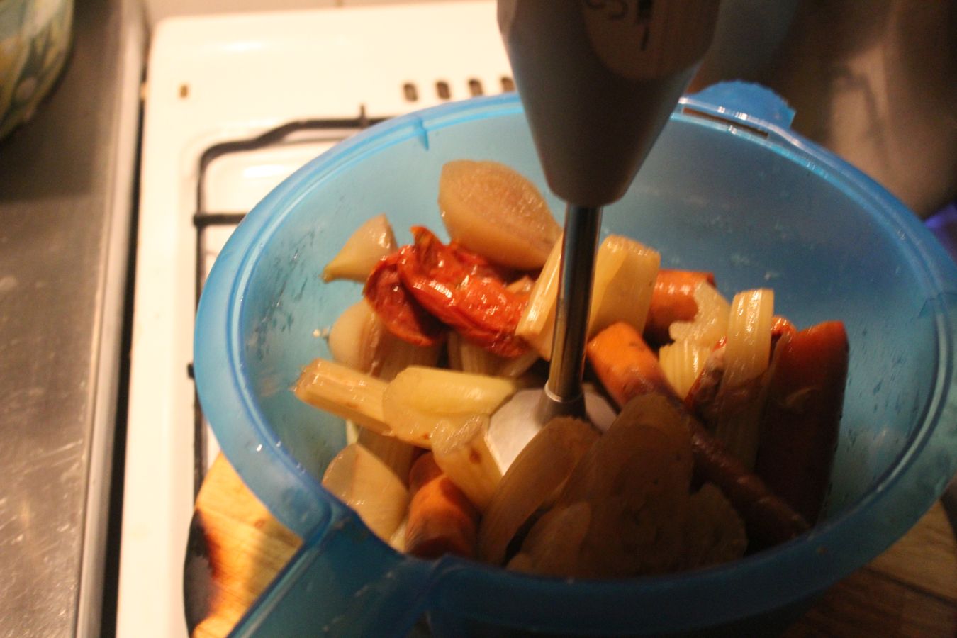 Ich setze heute aber noch einen drauf und nehme das Gemüse aus der Brühe, um daraus eine Gemüsepaste zu machen, mit der man Soßen binden kann. Als weiteres Plus sitzt darin ja auch noch der Geschmack der Brühe. Damit kann man immer eine gute Soße binden, wenn man mal etwas mit Soße versehen will, das nur wenig Soßenbasis hat.