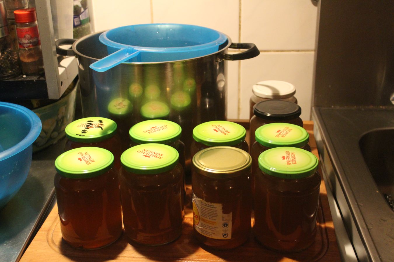 Meinen 20 Liter Topf spüle ich dann aus und packe die fest zugedrehten Brühegläser hinein. Wieder mit Wasser auffüllen und den Topf auf den Herd stellen, bis das Wasser kocht. Dann wieder auf Simmertemperatur runterdrehen und 90 Minuten im Topf lassen, nachdem das Wasser heiß ist. Dann ziehen die Gläser ein Vakuum und halten mindestens ein Jahr.