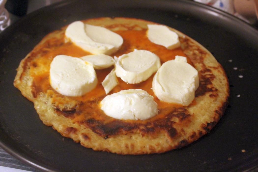 Pfannkuchen nachdem der von beiden Seiten ausgebacken wurde auf ein Pizzablech legen