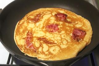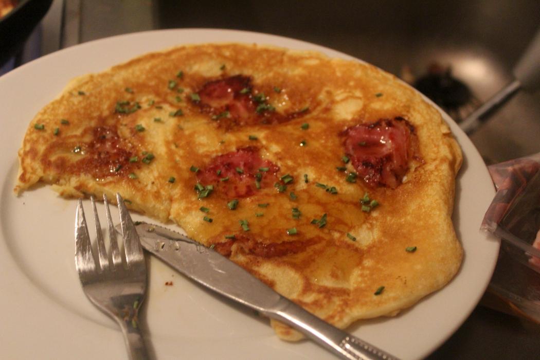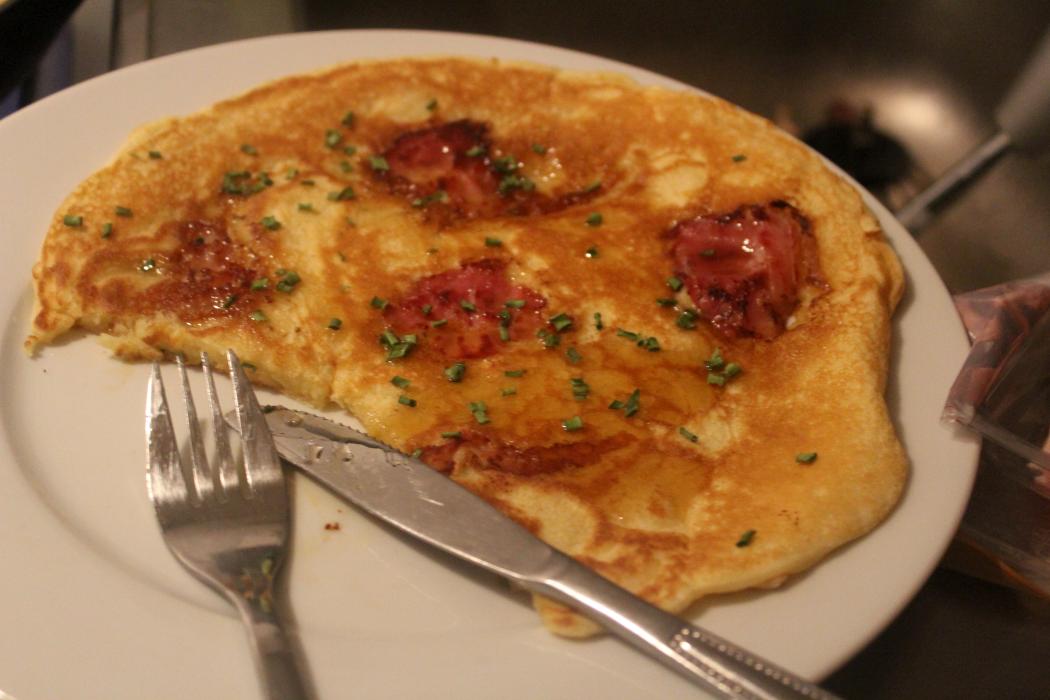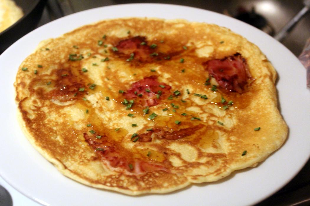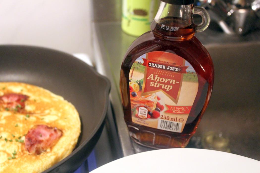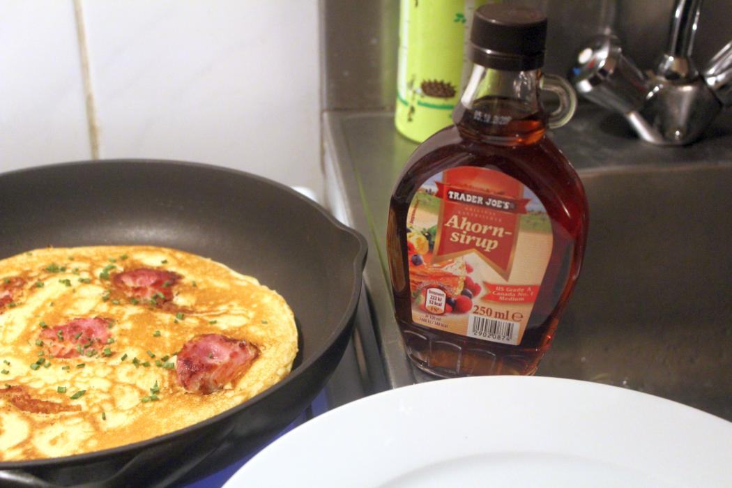 Und jetzt bringe ich die Ehestute mal wieder zum Wiehern, den Pfannkuchen mit Bacon mit ein wenig Ahornsirup tränken