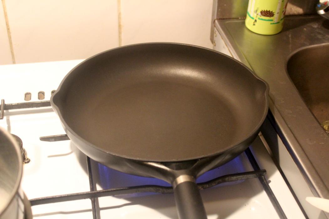 Dann gibt es jetzt eben noch einen richtig pikanten Pfannkuchen für die Dame des Hauses. Butter in die Pfanne geben, Pfannkuchen ausbacken und schon mal den Ofen auf 200 Grad stellen.
