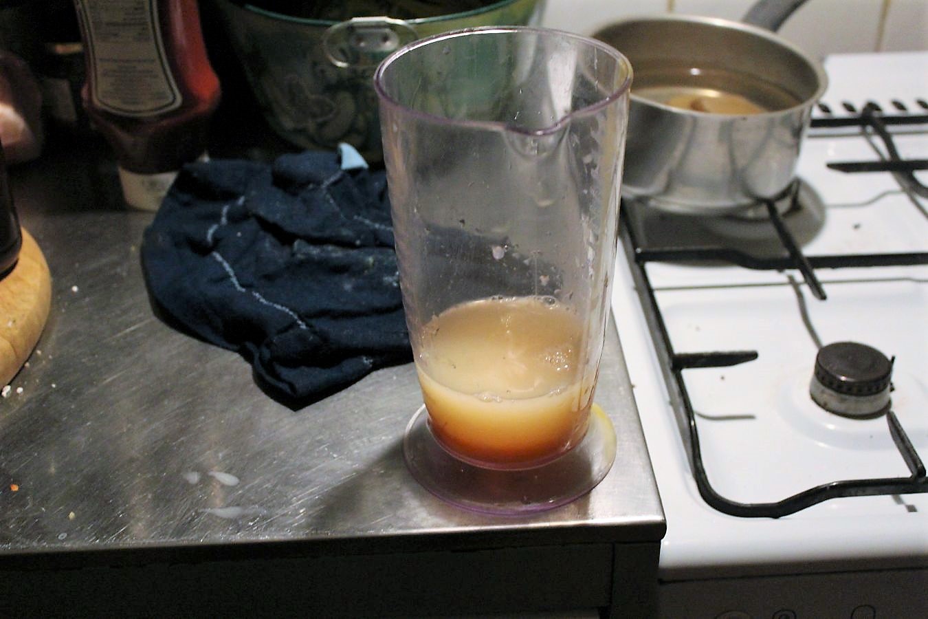 Ich fange schon mal mit der Soße an. Drei Eier aufschlagen und das Eigelb vom Eiweiß trennen. Eigelb in den Mixbecher geben.