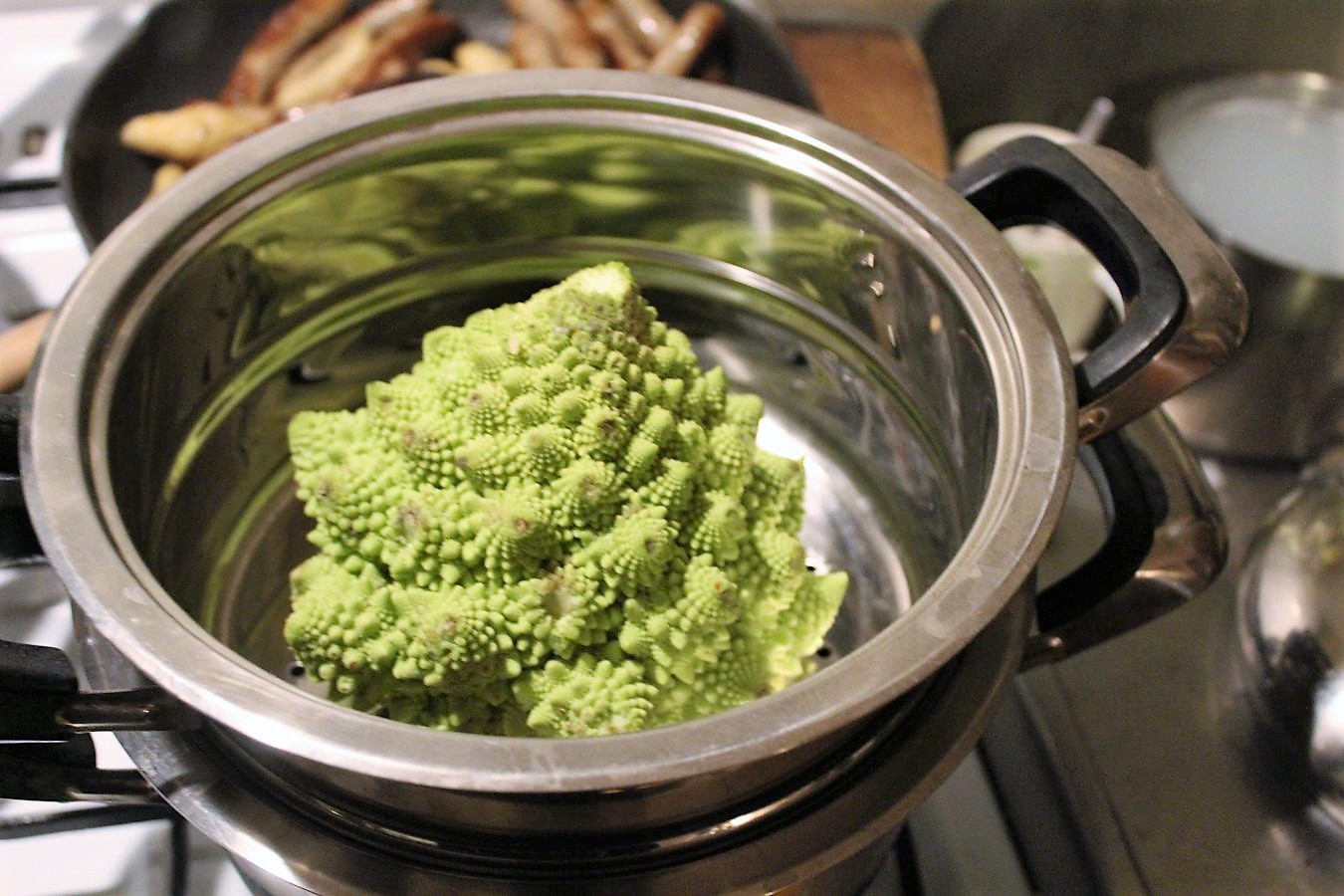 Ich lasse den Romanesco schon mal im Dampfaufsatz probeliegen. Hat das bei mir schon mal jemand gesehen? Genau, das liegt daran, dass ich so selten irgendwas auf diese Art verarbeite.