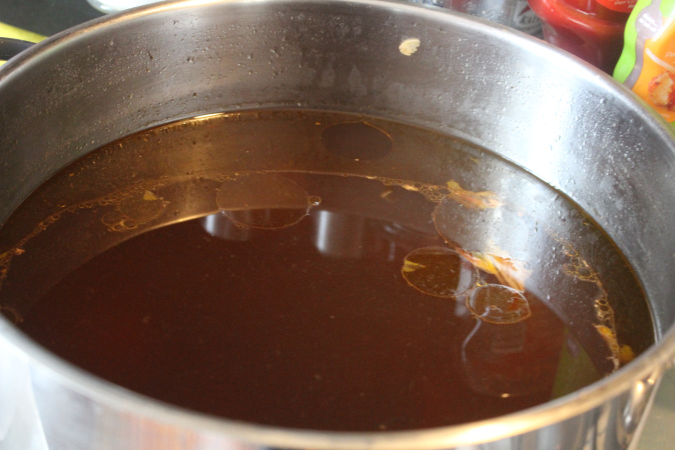 Wenn die Brühe kurz gesprudelt hat, auf die kleinste Herdplatte umziehen und nur so hoch einregeln, dass die Brühe leicht simmert.
