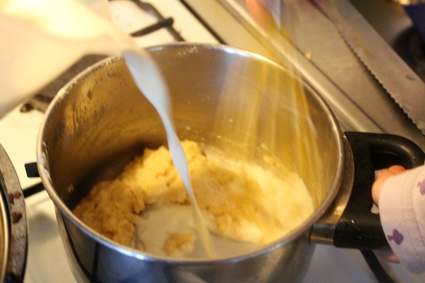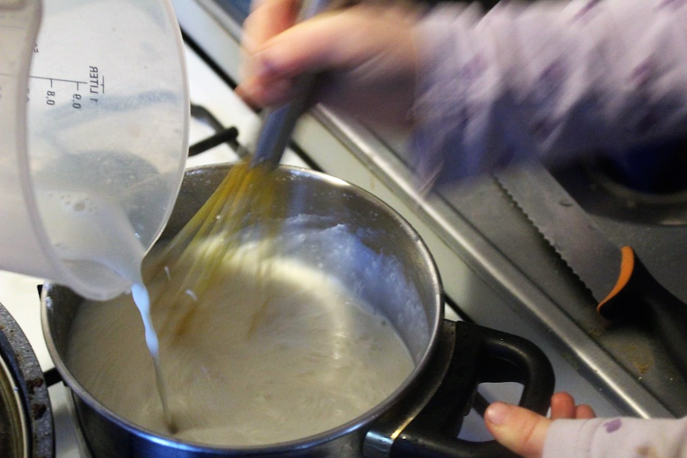 700 Milliliter Milch schluckweise zum Mehl-Buttermix geben und unter ständigem Rühren klumpenfrei rühren.