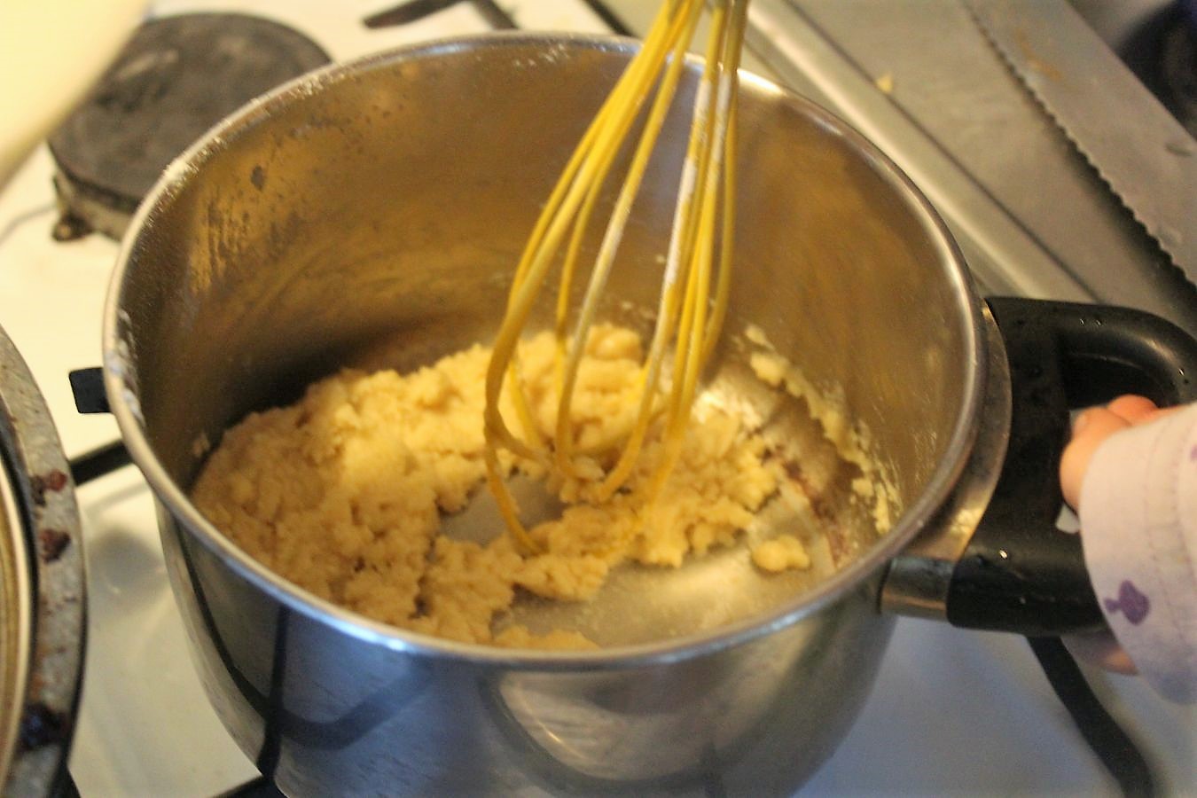 Unter ständigem Rühren mit dem Schneebesen die 50 Gramm Mehl mit der Butter verbinden.