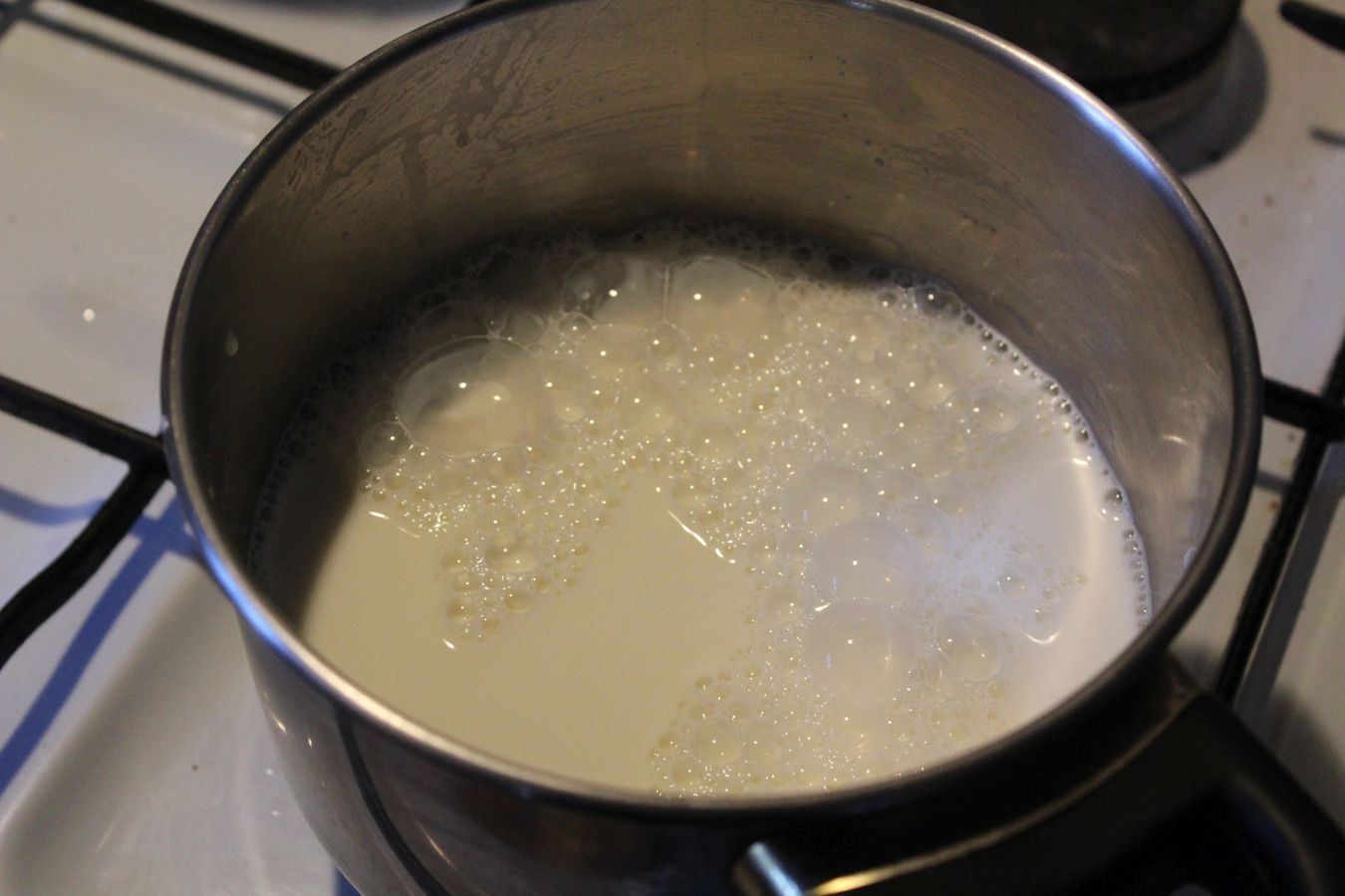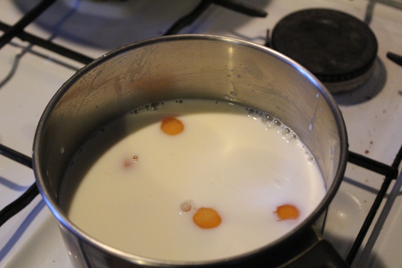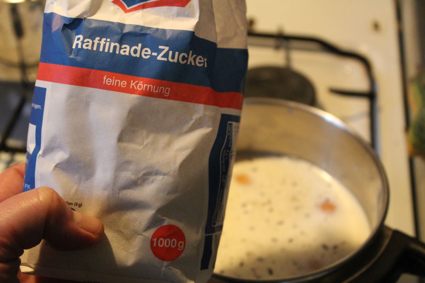 3 bis 5 Esslöffel Zucker. Mütter tendieren zu 3 Löffeln, Kinder fordern 5 ein und Väter richten sich immer danach, ob die Mutter zuhause ist, oder nicht und wem in dem Fall nachgegeben wird. Die Milch und die Eier mit dem Schneebesen verrühren und die Milch erhitzen, aber nicht kochen. Das Ei darf nicht stocken