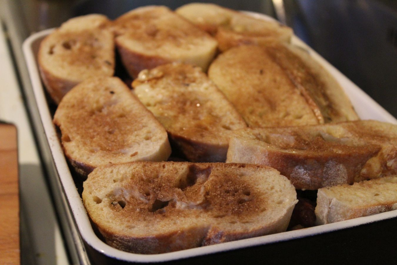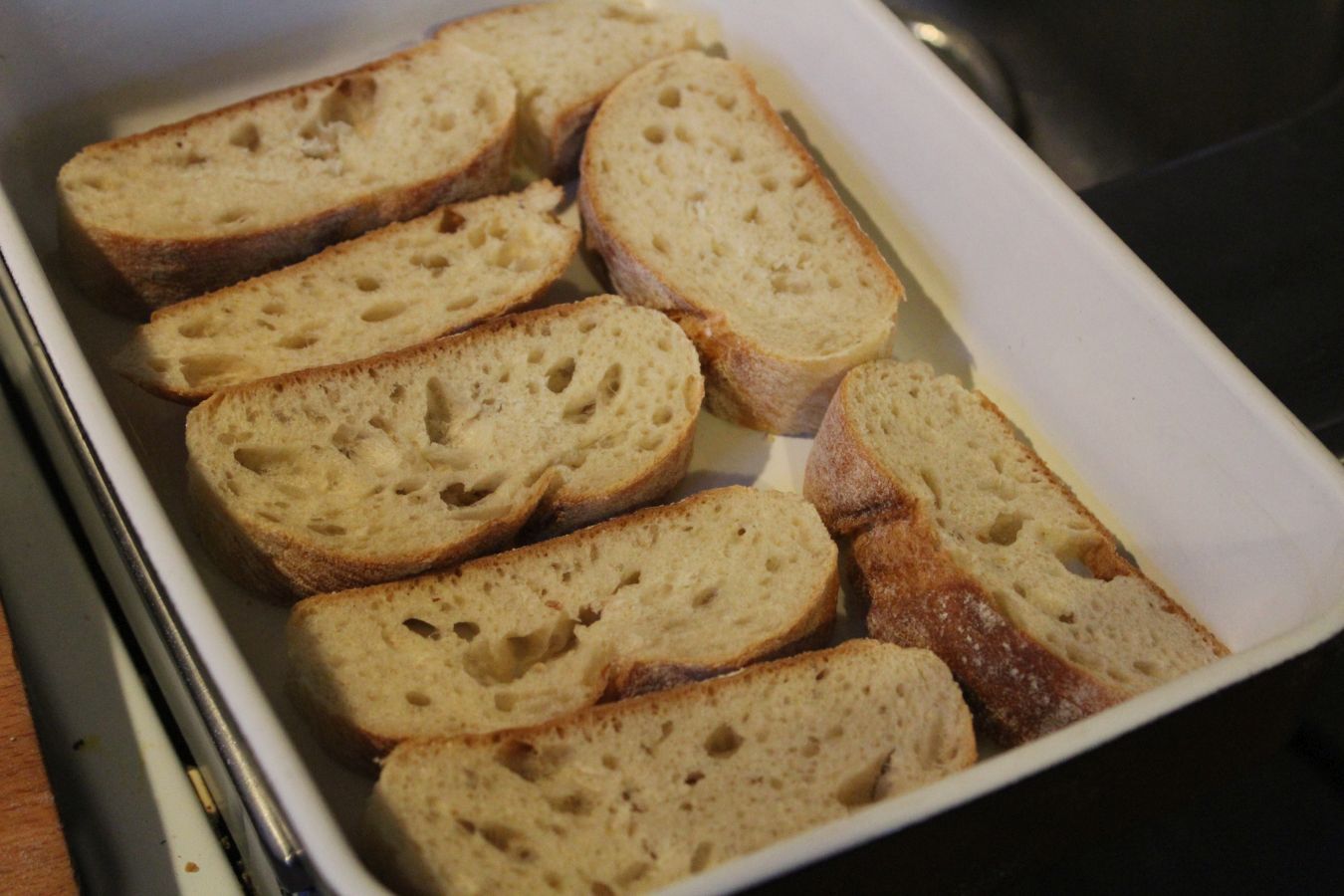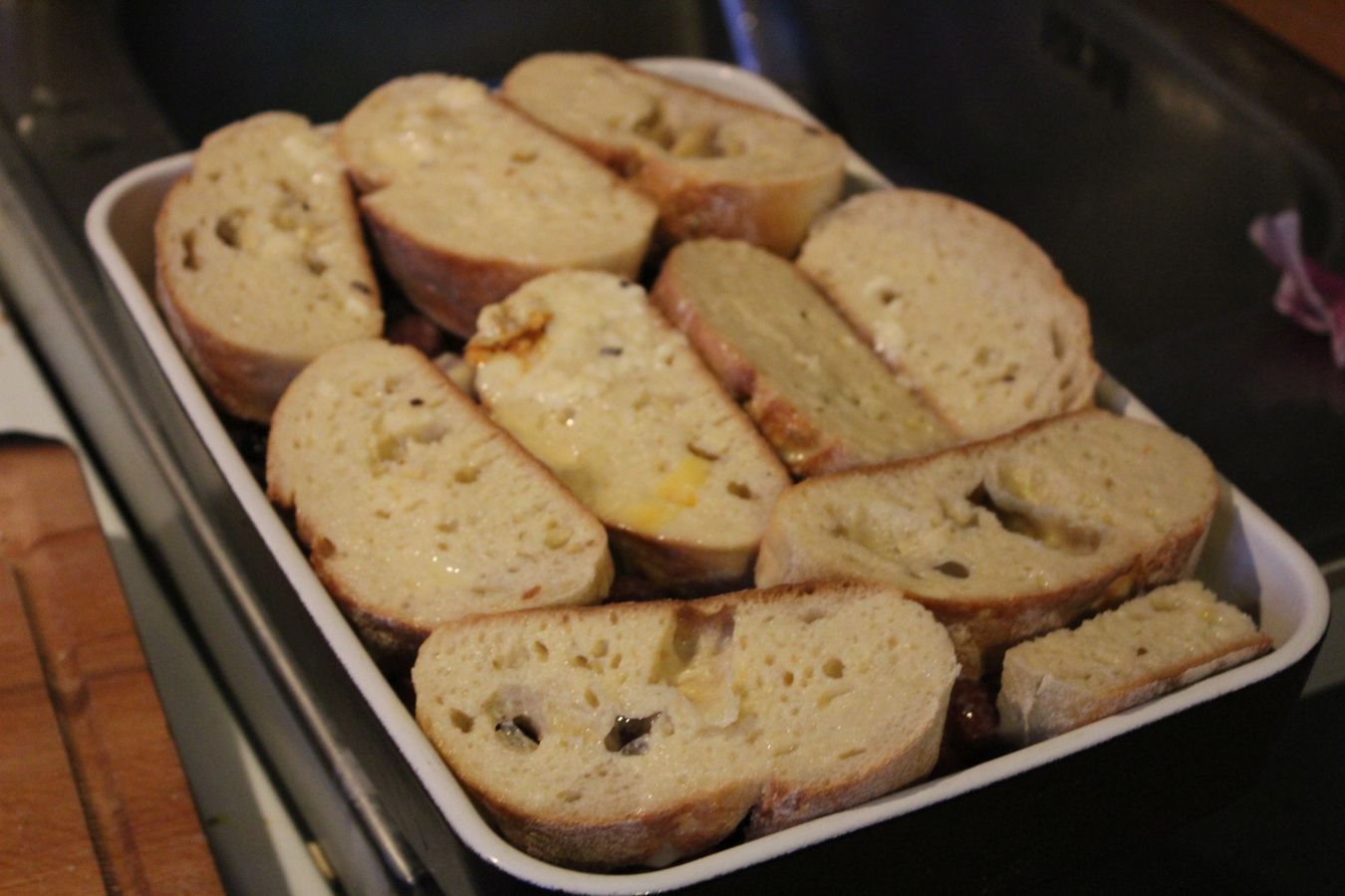 Brotscheiben in einer Auflaufform auslegen. Das ist nur die erste Lage