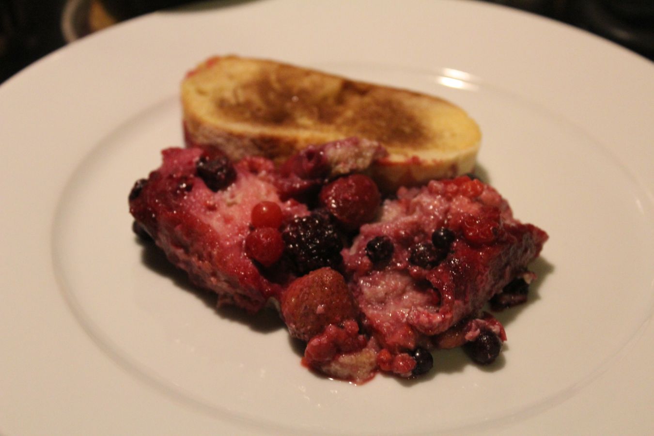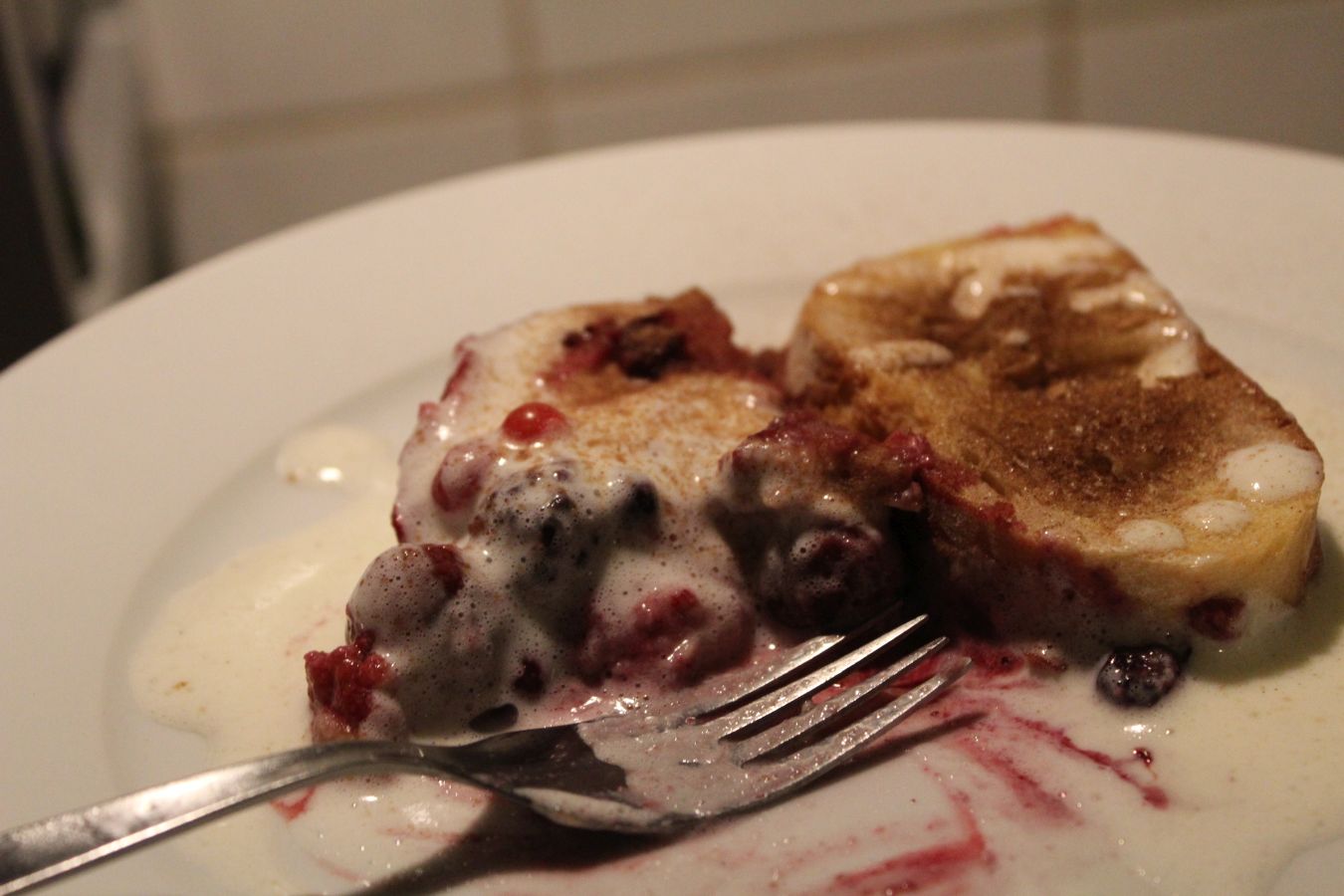 Oha, das ist richtig lecker, aber das ist überhaupt kein Hauptgericht. Das ist für mich ein Nachtisch, egal welche Mengen man davon isst. Das Brot ist an den Kanten knusprig, in der Mitte zart, geschmacklich toll mit der gestockten süßen Milch und Vanille und Zimt. Die Beeren mit der Säure sind dazu als Kontrast toll und Vanillesoße ist sowieso konkurrenzlos, wenn sie frisch gemacht ist.