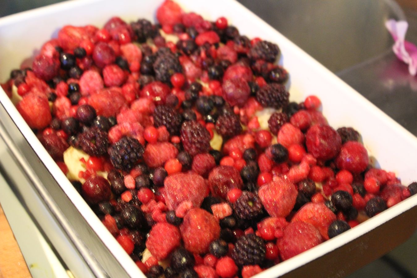 Hier ist meine Beerenmischung aus der Tiefkühlung. Frisches Obst wäre mir auch lieber, aber die Kinder wollten unbedingt Beeren haben, die einen im Februar nicht gerade vom Strauch anspringen. Himbeeren, Brombeeren, Johannisbeeren, Erbeeren und Sauerkirschen