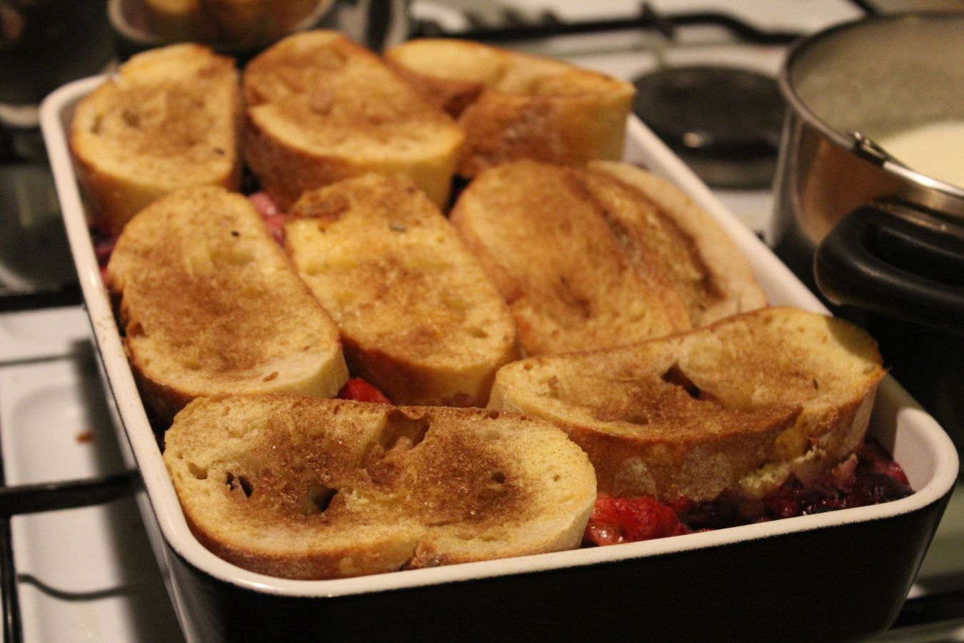 Die Auflaufform in den heißen Ofen stellen. Ich habe nur meinen lahmen Gasofen, der nur Unterhitze hat. Deswegen dauert darin alles ein wenig länger. Der braucht sage und schreibe eine Stunde, bis das Brot oben kross, die Beeren aufgetaut und warm und das Brot unten in der Form auch gut gebacken ist. Wer einen Ofen mit Ober- und Unterhitze hat, wird in 40 Minuten durchs Ziel sein. In der Zwischenzeit koche ich noch schnell auf besonderen Wunsch eine frische Vanillesoße ein.