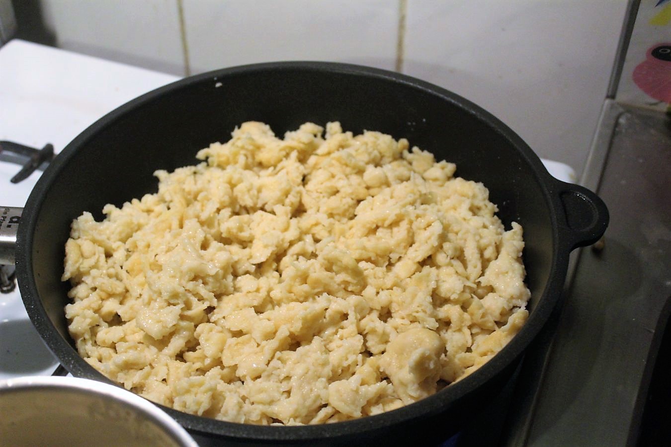 Für die acht Kinder am Tisch, habe ich aus einem Kilo Mehl Spätzle gemacht. Das kann man auch als Beilage zum Schweinebauch nehmen, ich wäre aber eher bei Kartoffeln