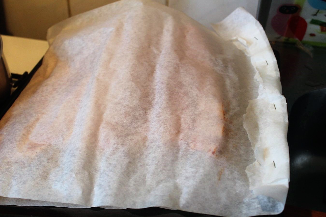 Weil das hauptsächlich Fett ist, bin ich froh, wenn ich das Backblech hinterher nicht so schrubben muss. Das sieht noch aus, wie ne Jungfrau.