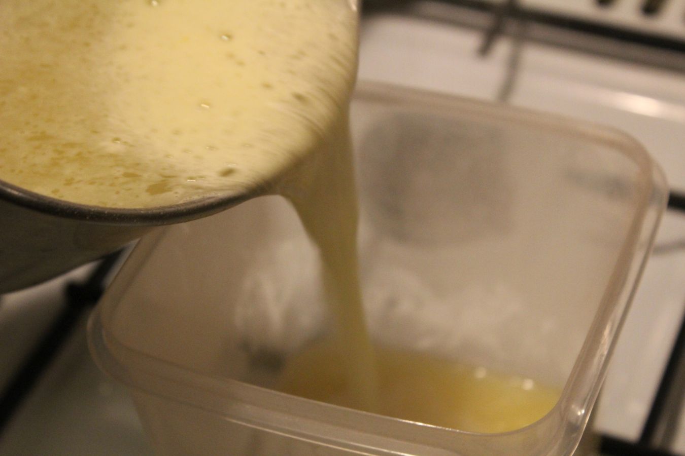 Man kann die natürlich in Puddingschalen füllen, oder so wie ich in einen Gefrierbehälter.