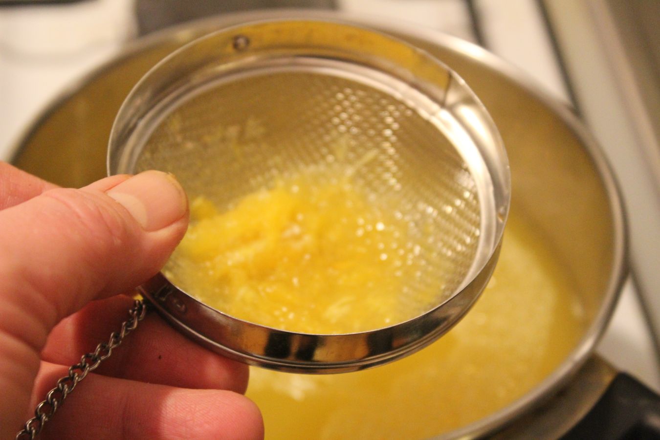 Damit die Götterspeise möglichst klar wird, den Inhalt des Litermaßes durch ein Sieb in den Topf kippen.