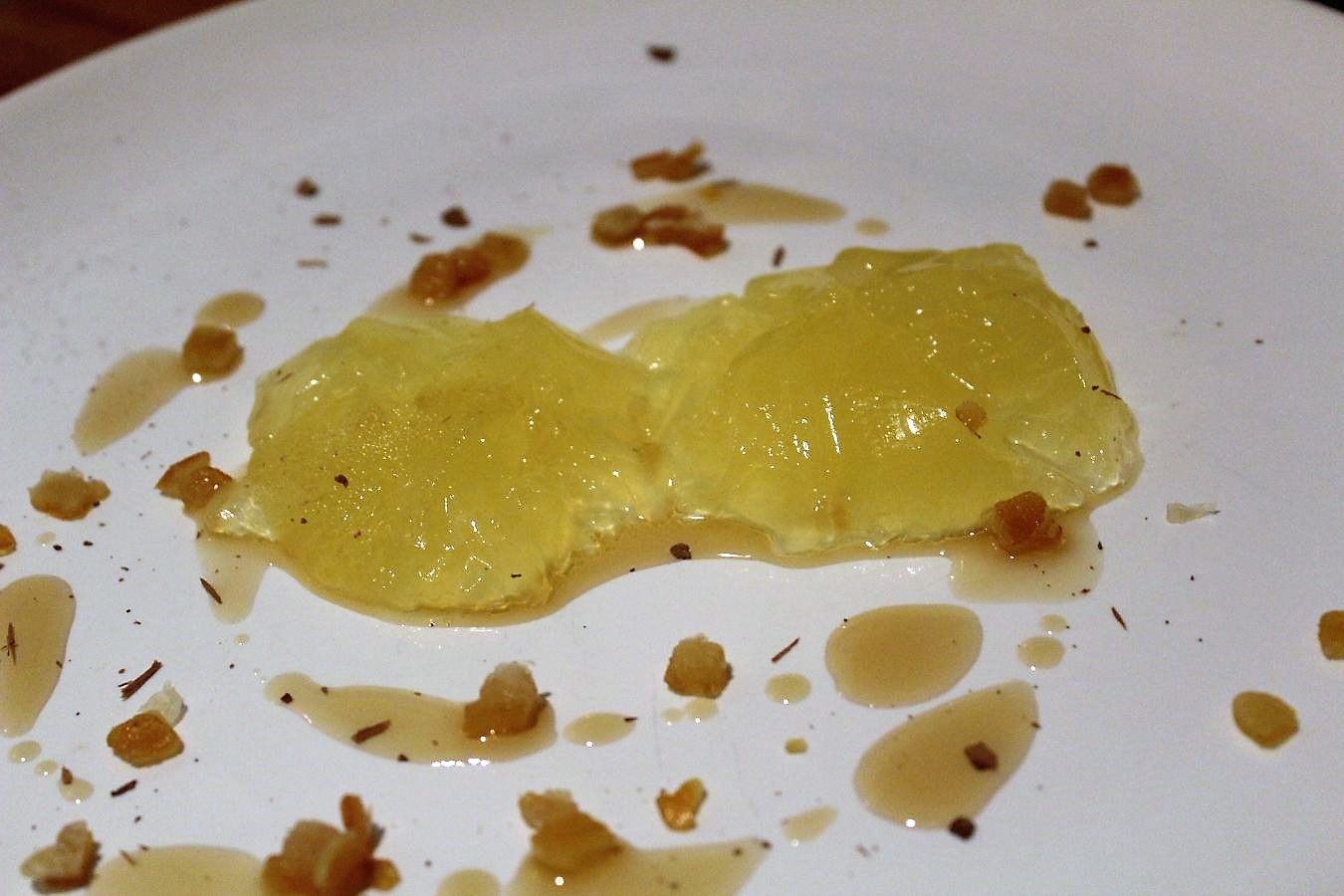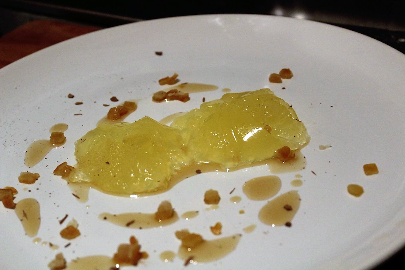 Ein paar Nocken Götterspeise auf den Teller geben und dann optional mit Orangeat bestreuen.