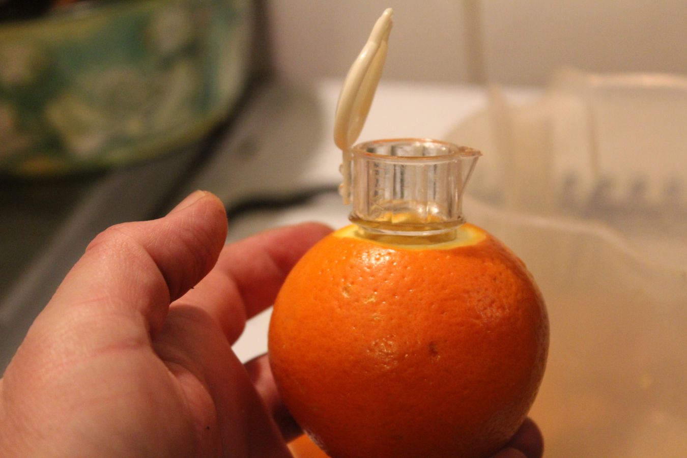 300 Milliliter Orangensaft in ein Litermaß füllen.