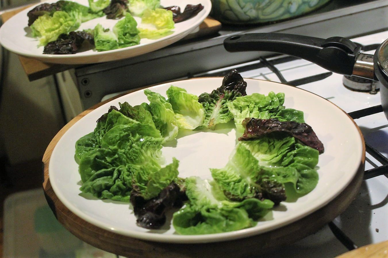 Die Teller mit Blattsalaten belegen