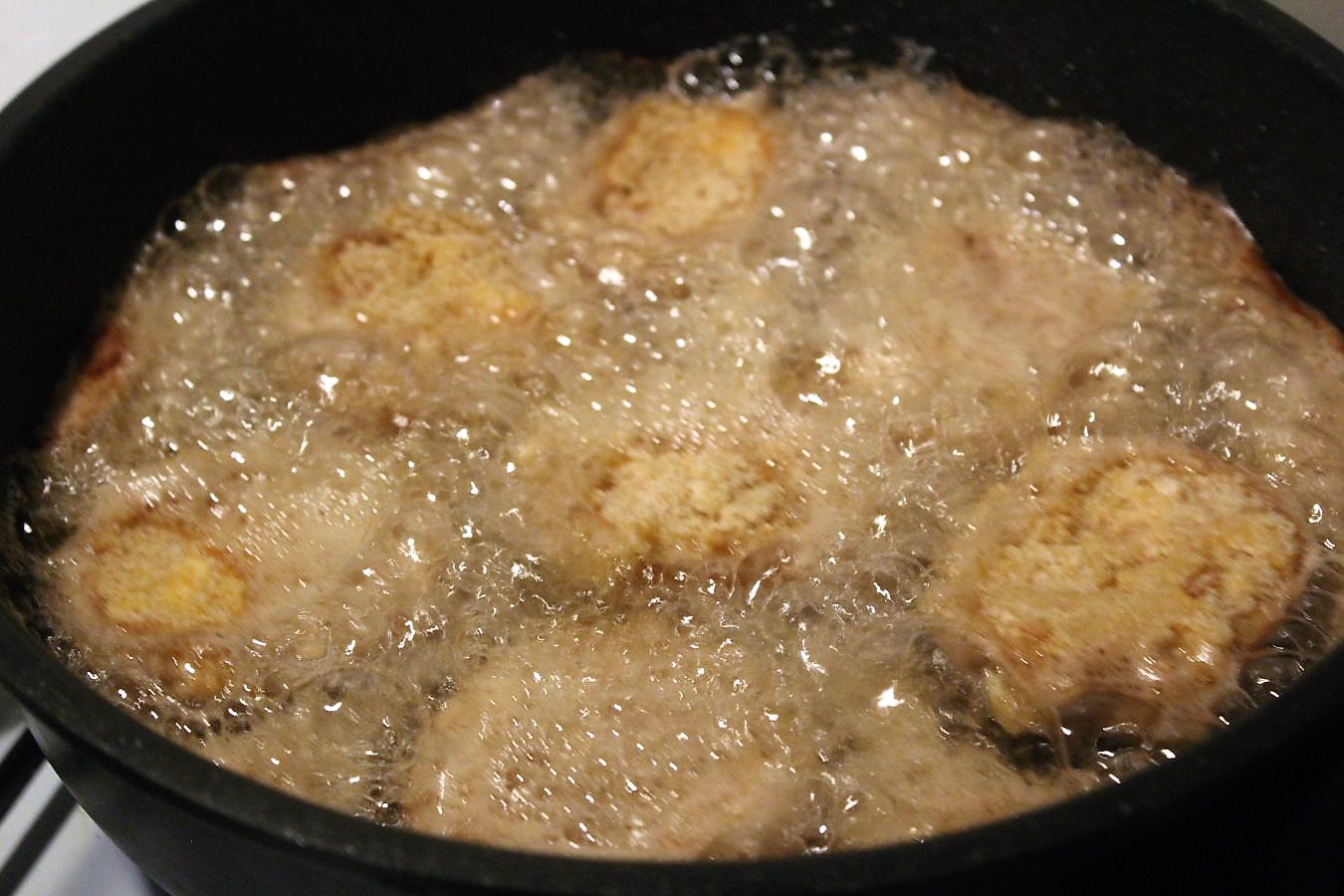 Das Pflanzenöl soll so hoch in der Pfanne stehen, dass die Tomatenscheiben zumindest halb bedeckt sind. Dann hat mich die Gewissheit, dass sie von beiden Seiten gleichmäßig ausgebacken und gebräunt werden. Pfannenwender aus Holz in die Pfanne stellen und testen ob das Öl heiß ist. Wenn die Temperatur gut ist, steigen sprudelnde Perlen am Pfannenwender auf.