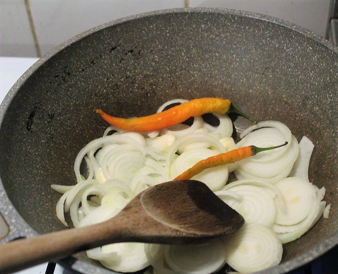 Peperoni in den Wok werfen