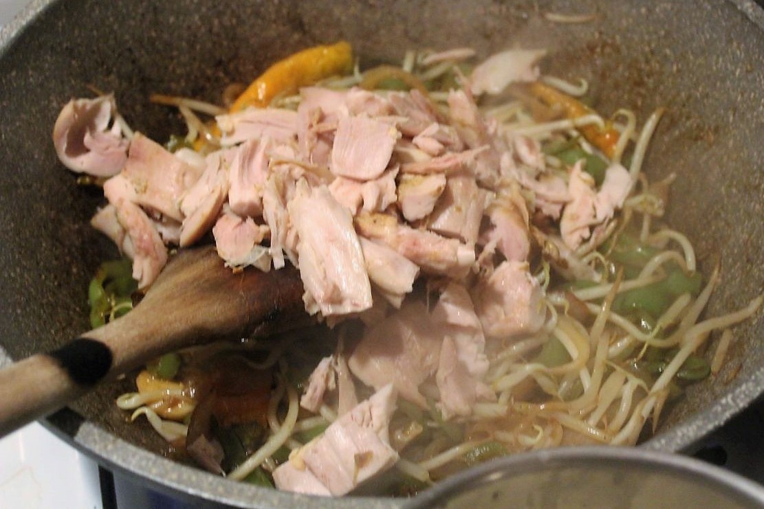 Das sind meine Hähnchenkeulen. Die habe ich im Ofen gegart und die Haut ist schon abgezogen. Die kommen aus dem Kühlschrank, damit man sie ein paar Tage lagern kann. Wer den Umweg über die Hähnchenkeulen sparen möchte, kann auch gerne eine frische Hähnchenbrust braten. Fleisch von den Knochen abziehen und in kleine Stücke schneiden.