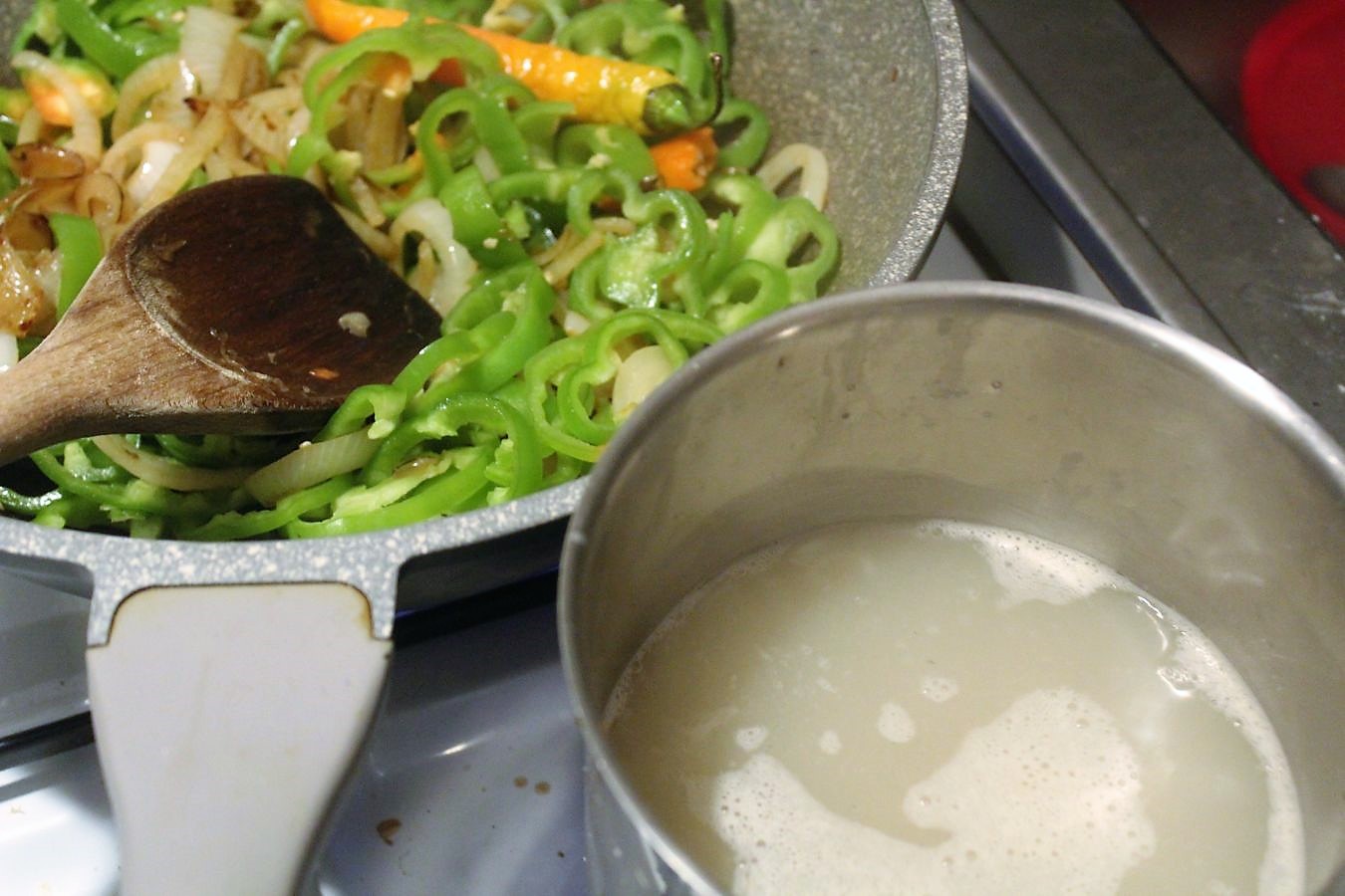 Der Reis kocht nebenbei auf einer kleineren Platte