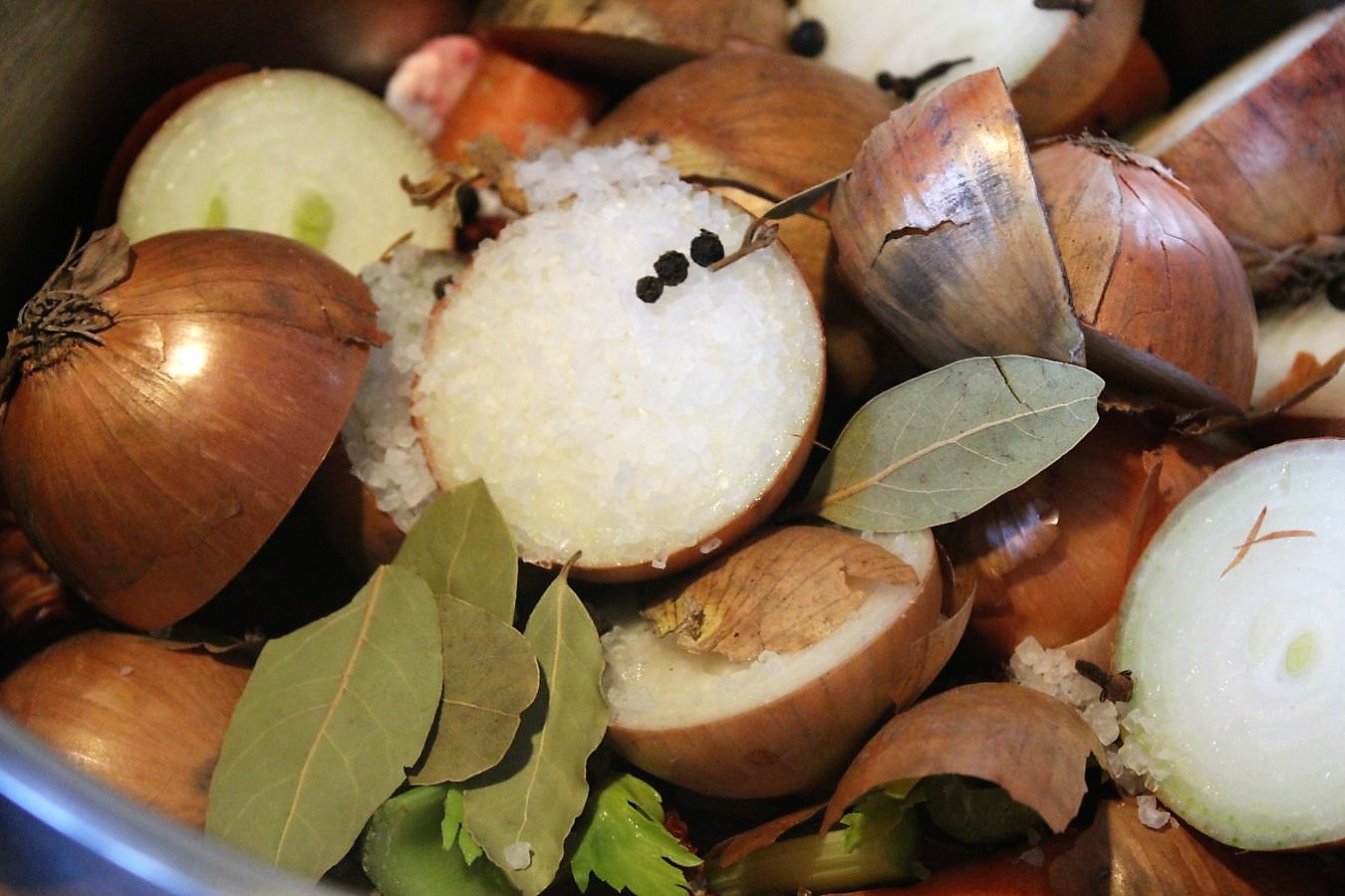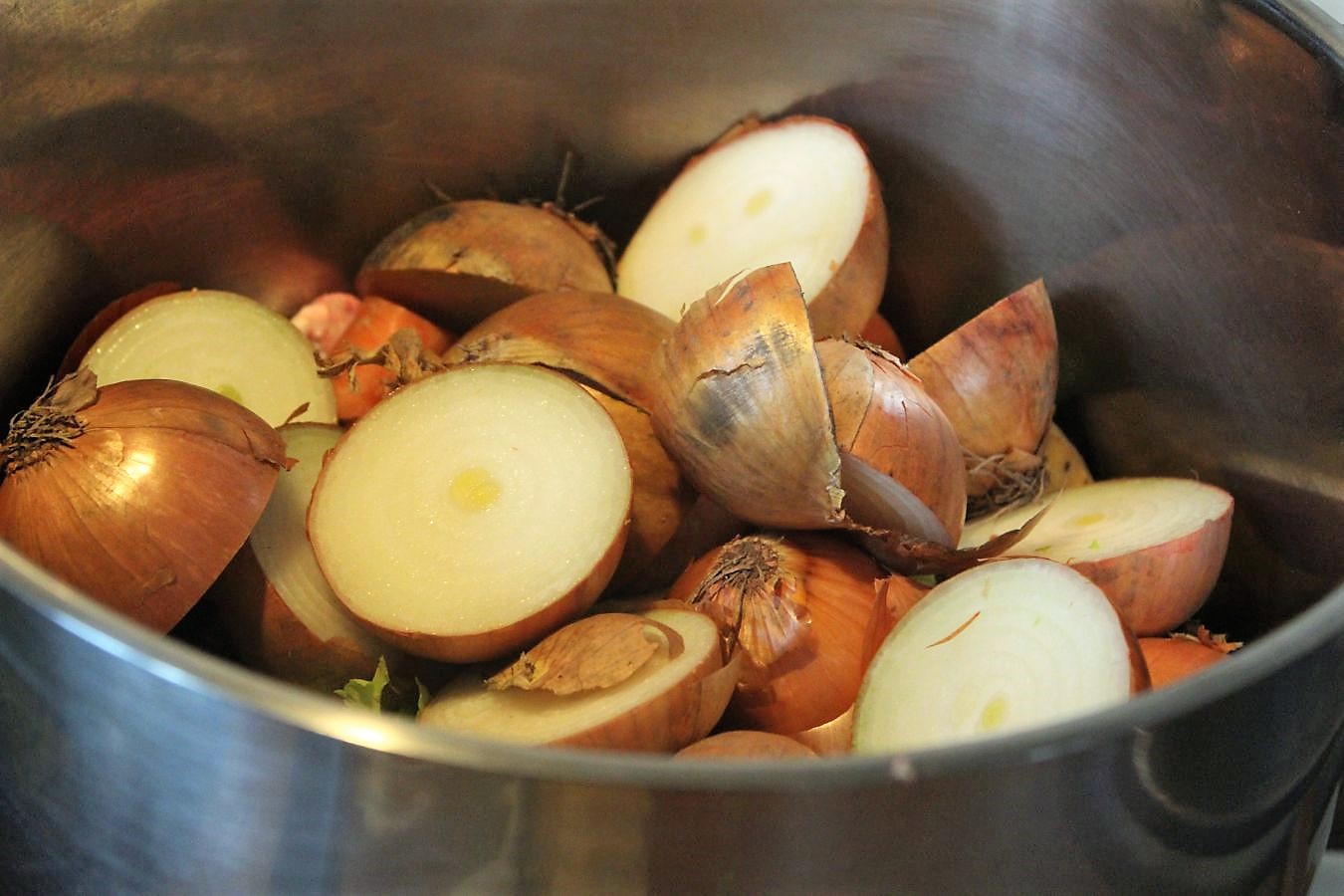 Zwiebeln zerteilen und die Schale dran lassen, das gibt der Brühe eine schöne goldene Farbe