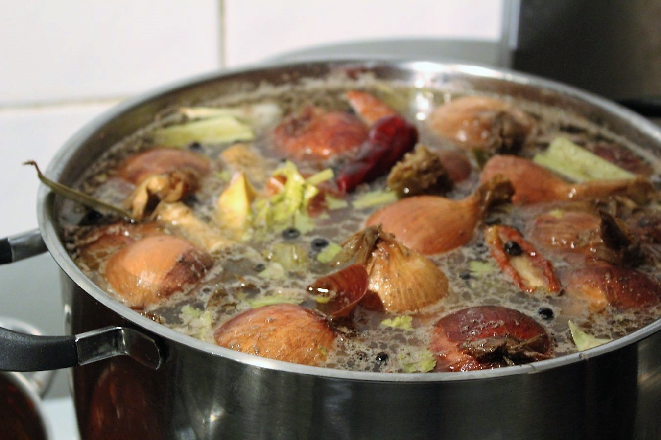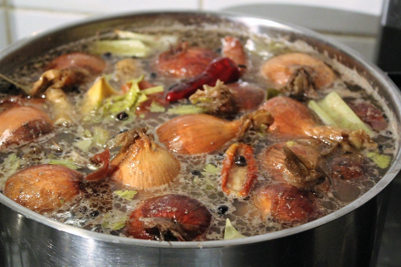 Sobald die Brühe köchelt (das kann schon mal eine Stunde dauern), ziehe ich auf die kleinste Herdplatte um und stelle die Temperatur so ein, dass der Topf nur leicht simmert und nicht sprudelt. Deckel bleibt immer auf dem Topf, damit keine Flüssigkeit verloren geht.