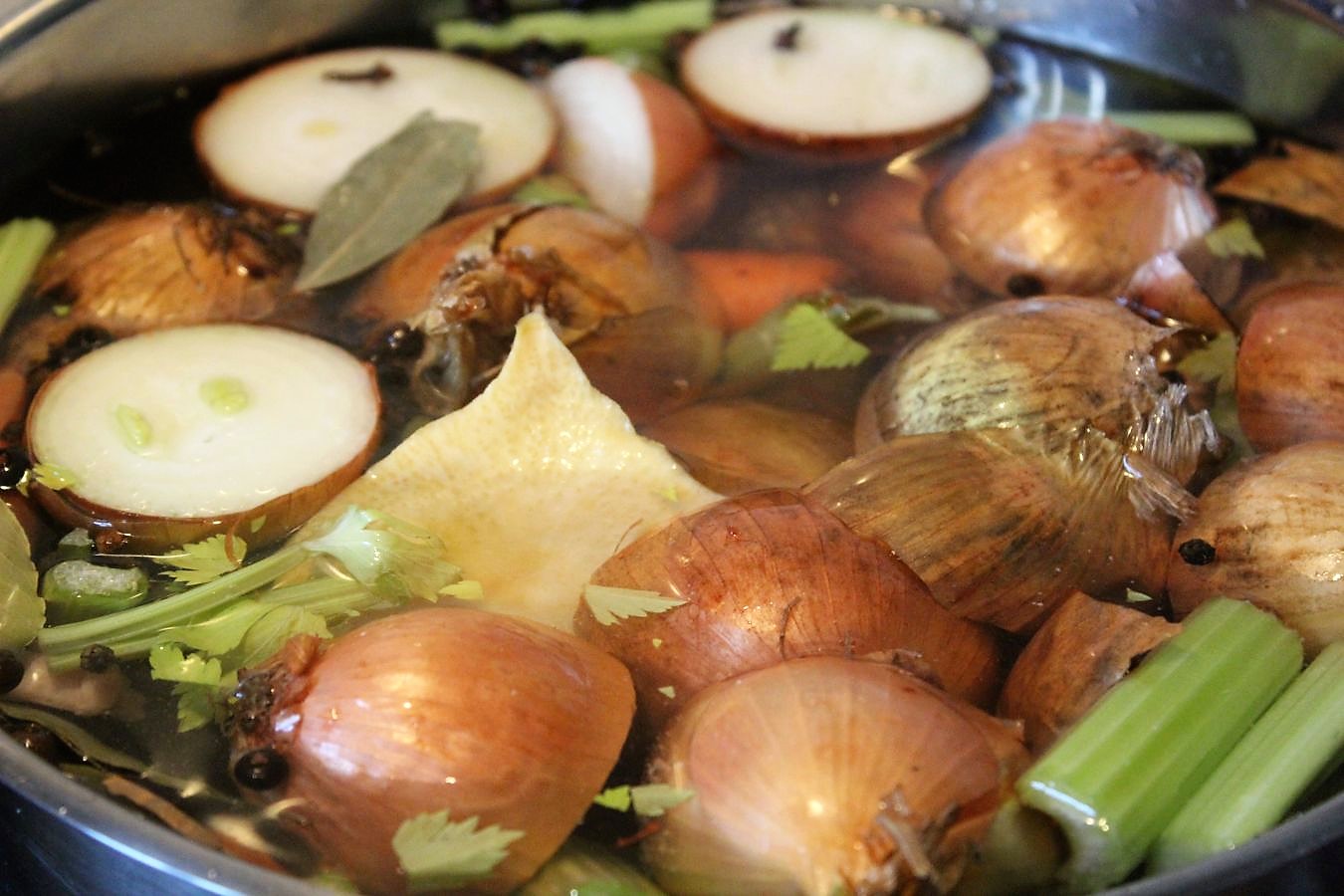 Die Zwiebeln könnte man noch in der Pfanne auf den Schnittflächen anrösten, aber an Geschmack und Farbe mangelt es meiner Brühe nie, deswegen verzichte ich auch den Akt.