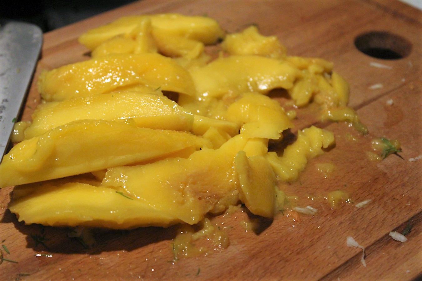 Fleisch der Mango von der Frucht schneiden und denn mit dem Messer mundgerecht zerkleinern