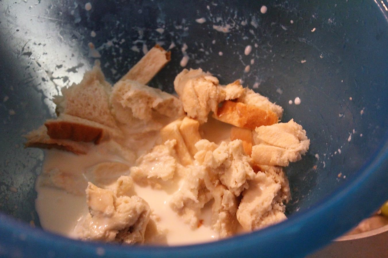 Die Zutaten miteinander verkneten. Beim nächsten Mal, werde ich die Milch mit dem Brötchen, bzw. dem Toast vor dem Kneten mit dem Pürierstab durchmischen, damit man keine sichtbaren Brotstücke mehr im Teig hat. Das ist aber auch nur die Essenz der Restrospektive. Stört nicht den Geschmack, aber würde mir optisch besser gefallen.
