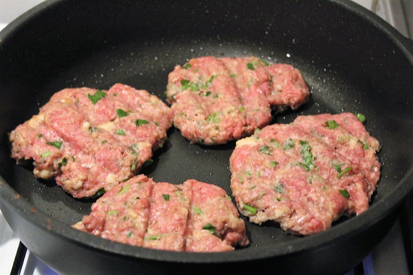 Charakteristisch für das Beefsteak ist ein Wellenmuster, das man durch Eindrücken mit einem Messerrücken bekommt. Dann sehen sie Beefsteaks so aus, als wenn man sie auf dem Grillrost gegart hätte