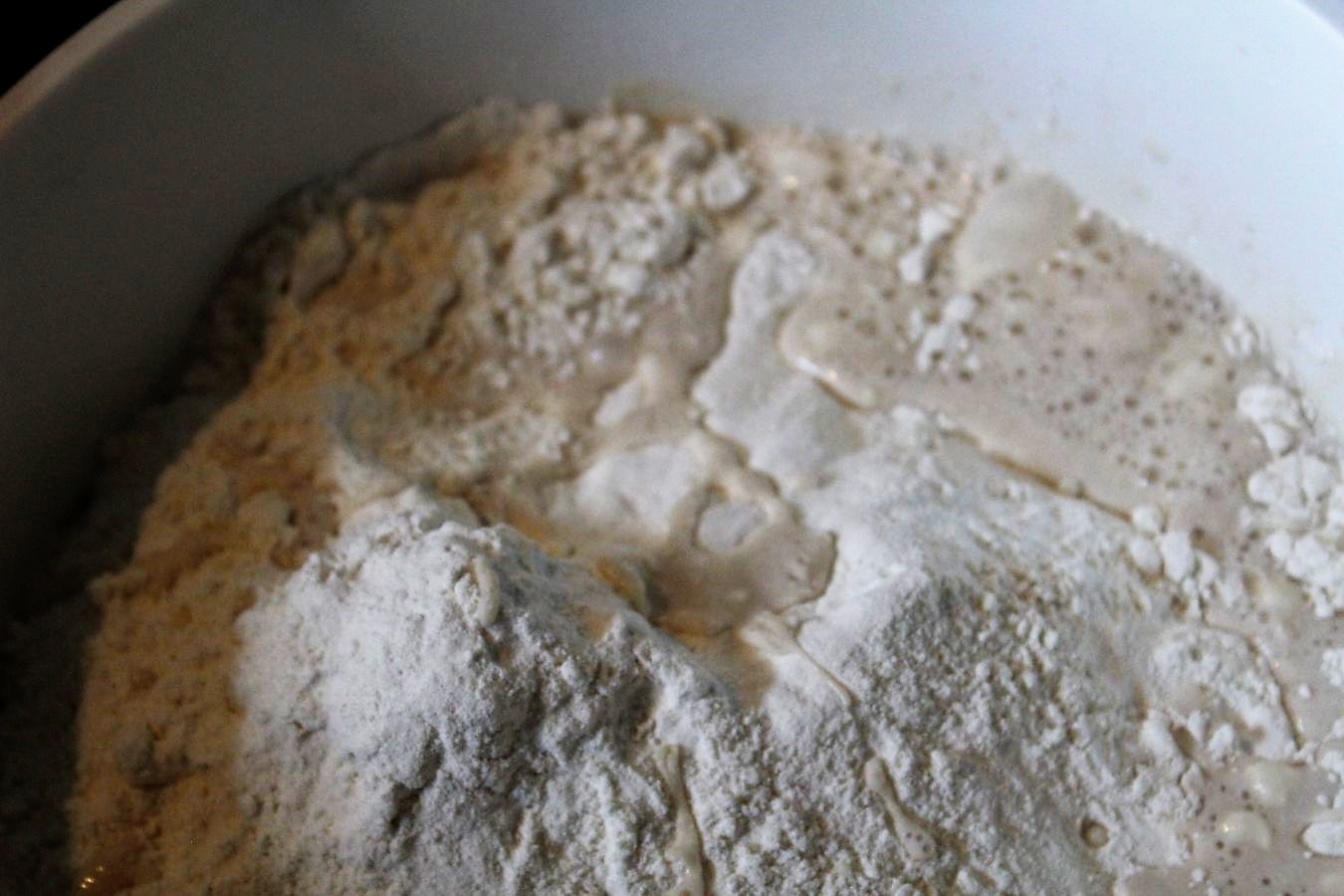 Alle Zutaten in die Schüssel geben und die aufgelöste Hefe ebenfalls in die Schüssel kippen.