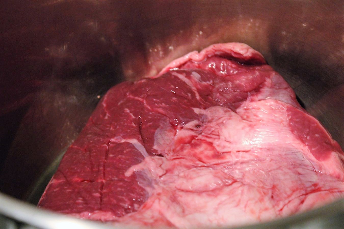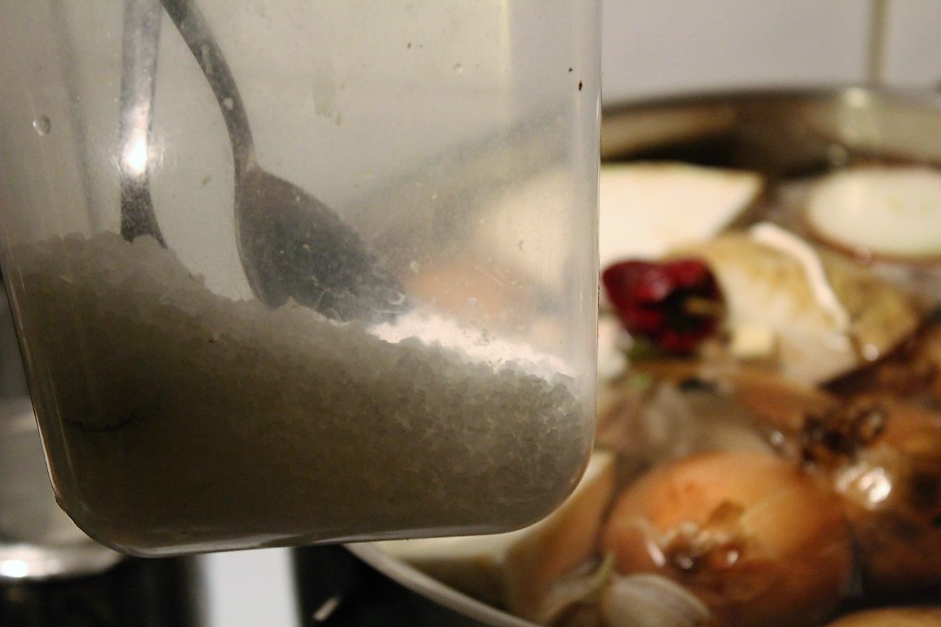 Das was ich jetzt mache ist umstritten, weil ich das Fleisch hinterher weiter verwende und trotzdem die Brühe salze. Ich habe deswegen hinterher noch nie Probleme mit dem Geschmack oder der Zartheit gehabt, Osmose hin oder her. Deswegen jetzt drei Esslöffel Meersalz in den Topf geben.