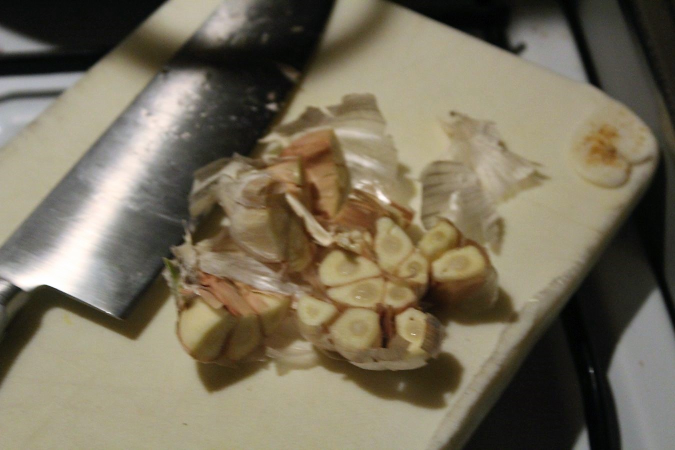 Ein Knoblauchknolle mit Haut und Haaren halbieren und ab in den Topf damit.