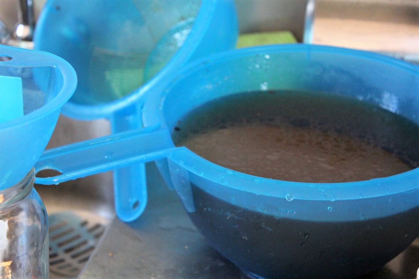 Die kippe ich durch ein Sieb, damit die festen Gemüsebestandteile raus kommen. Danach in Schraubgläser abfüllen.