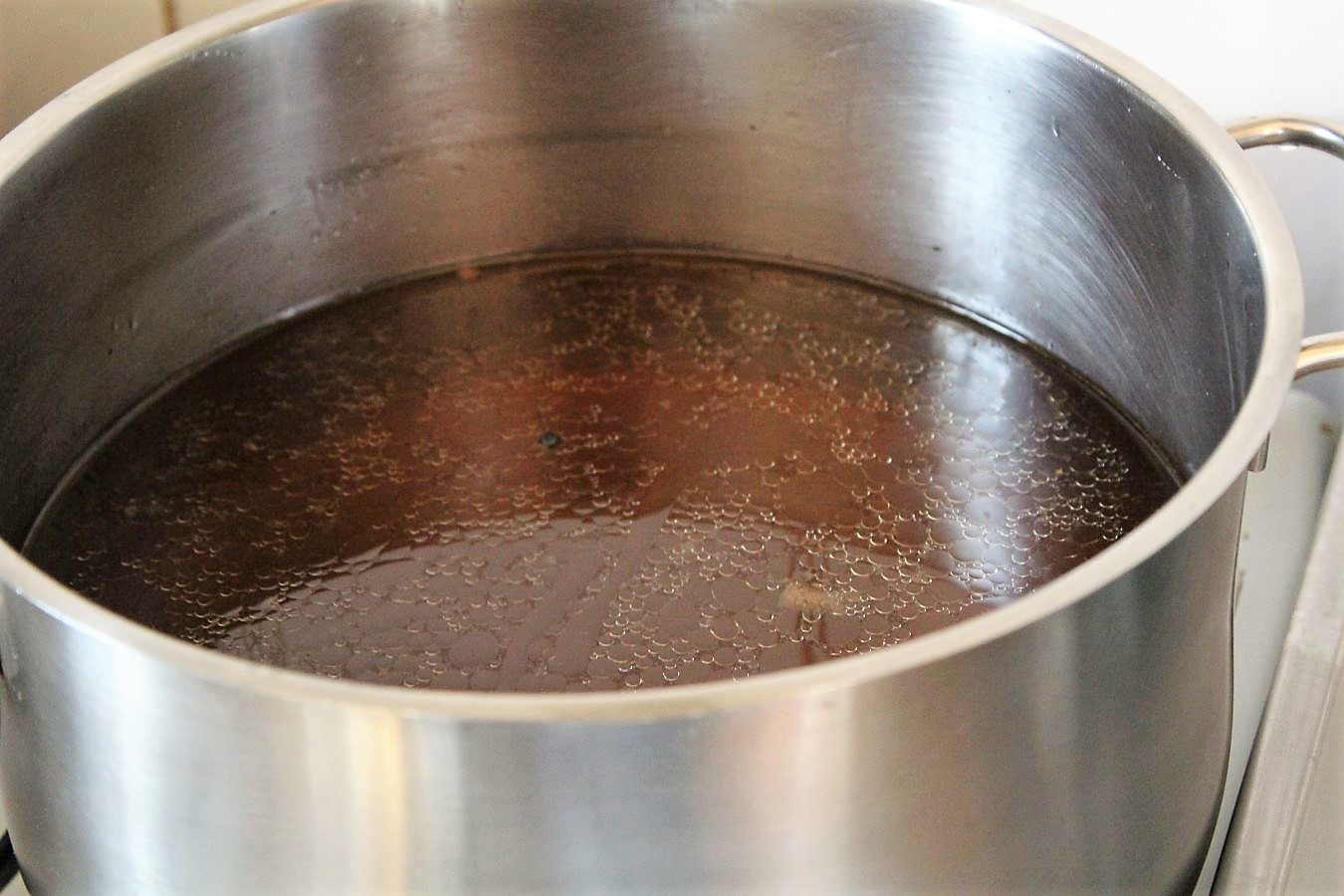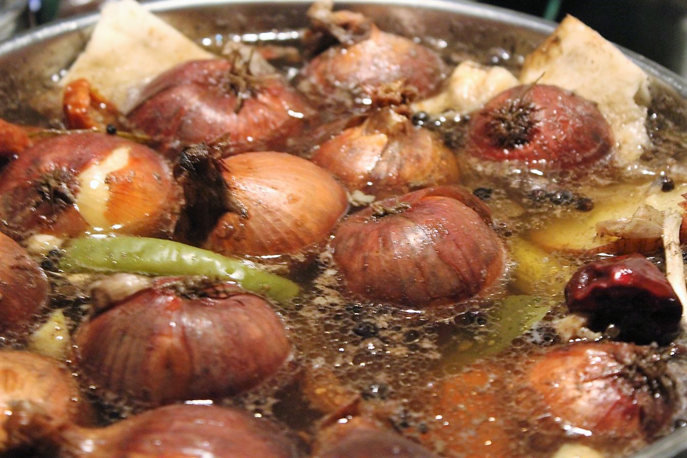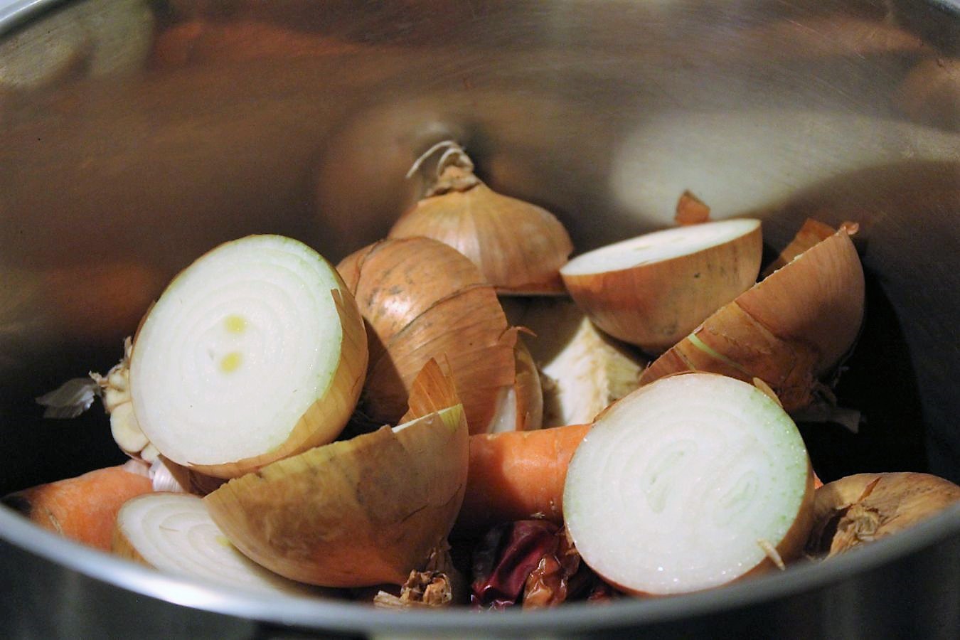 Zwiebeln halbieren und mit Schale in den Topf werfen. Das macht eine schöne goldene Farbe.