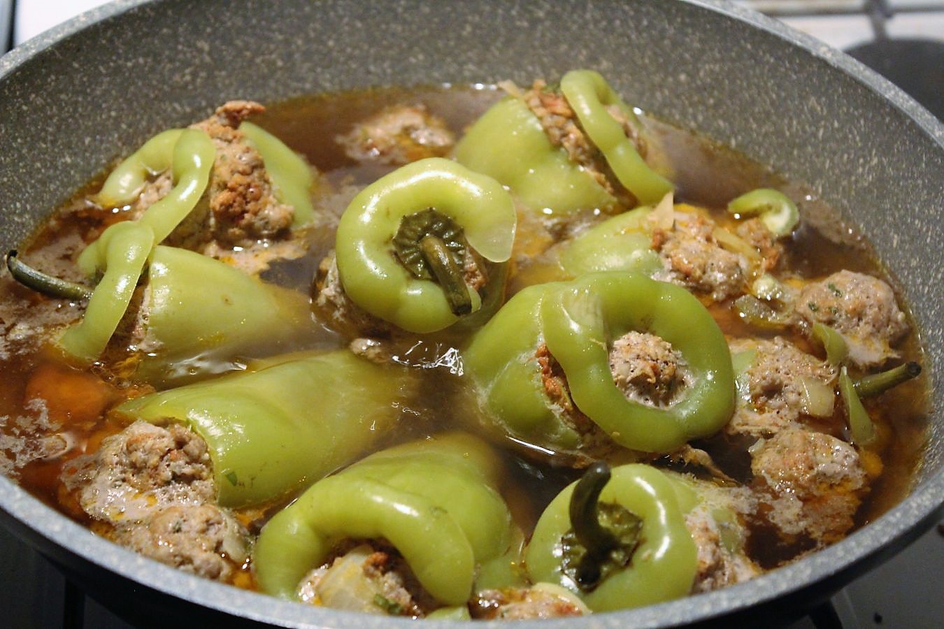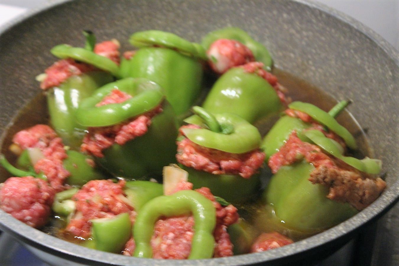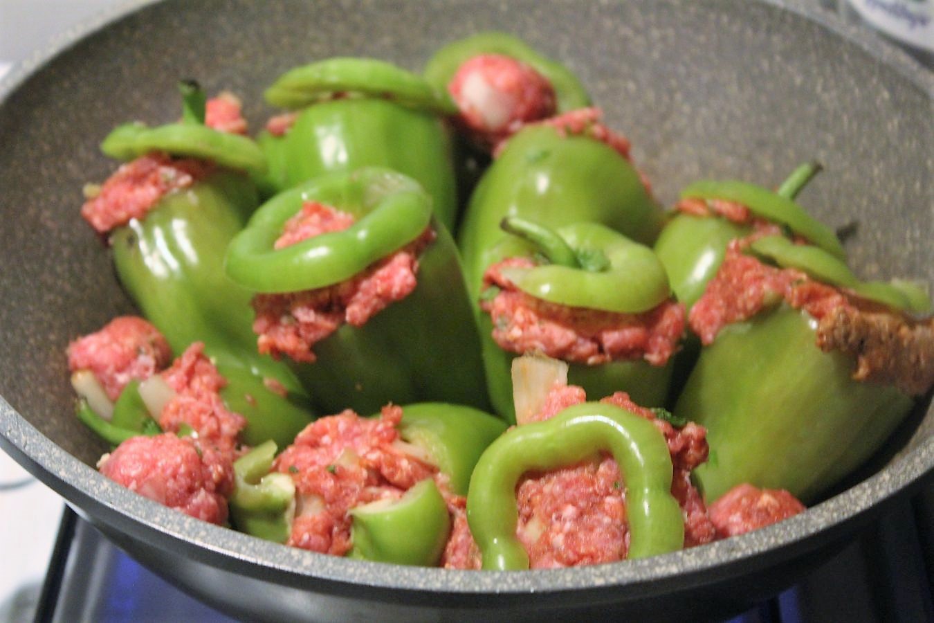 Die türkischen Paprikaschoten, die ich im Angebot beim Mix Markt gefunden habe, nennen sich Dolma und sind deutlich kleiner, als die handelsüblichen Paprika, die man sonst so in Deutschland verwendet. Ich finde das ganz praktisch, weil ich bei den großen Schoten oft das Gefühl habe, dass man zu wenig Paprika mit zu viel Fleisch auf dem Teller hat. So kann man mal eine Schote mehr essen und hat auch anteilig mehr Gemüse als Fleisch. Das mit dem Oberflächenverhältnis im Vergleich zur Masse führe ich nicht weiter aus.