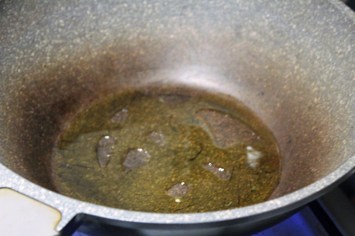 Bisher haben wir nur die Brühe und das was die Schoten beim Schmoren abgegeben haben im Wok. So sieht das erkaltet aus.