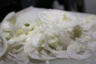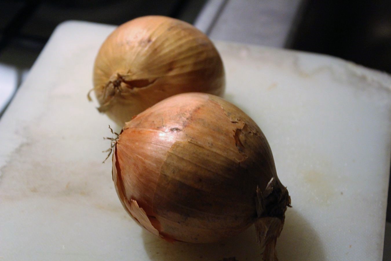 Zwei Zwiebeln häuten und auf dem Gemüsehobel dünn reiben.