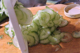 Gurken mit dem Gurkenhobel in dünne Scheiben schneiden.