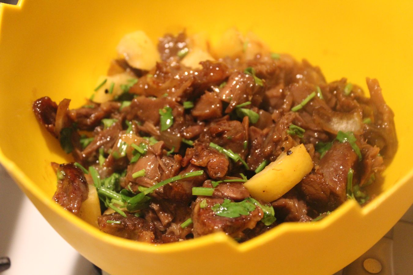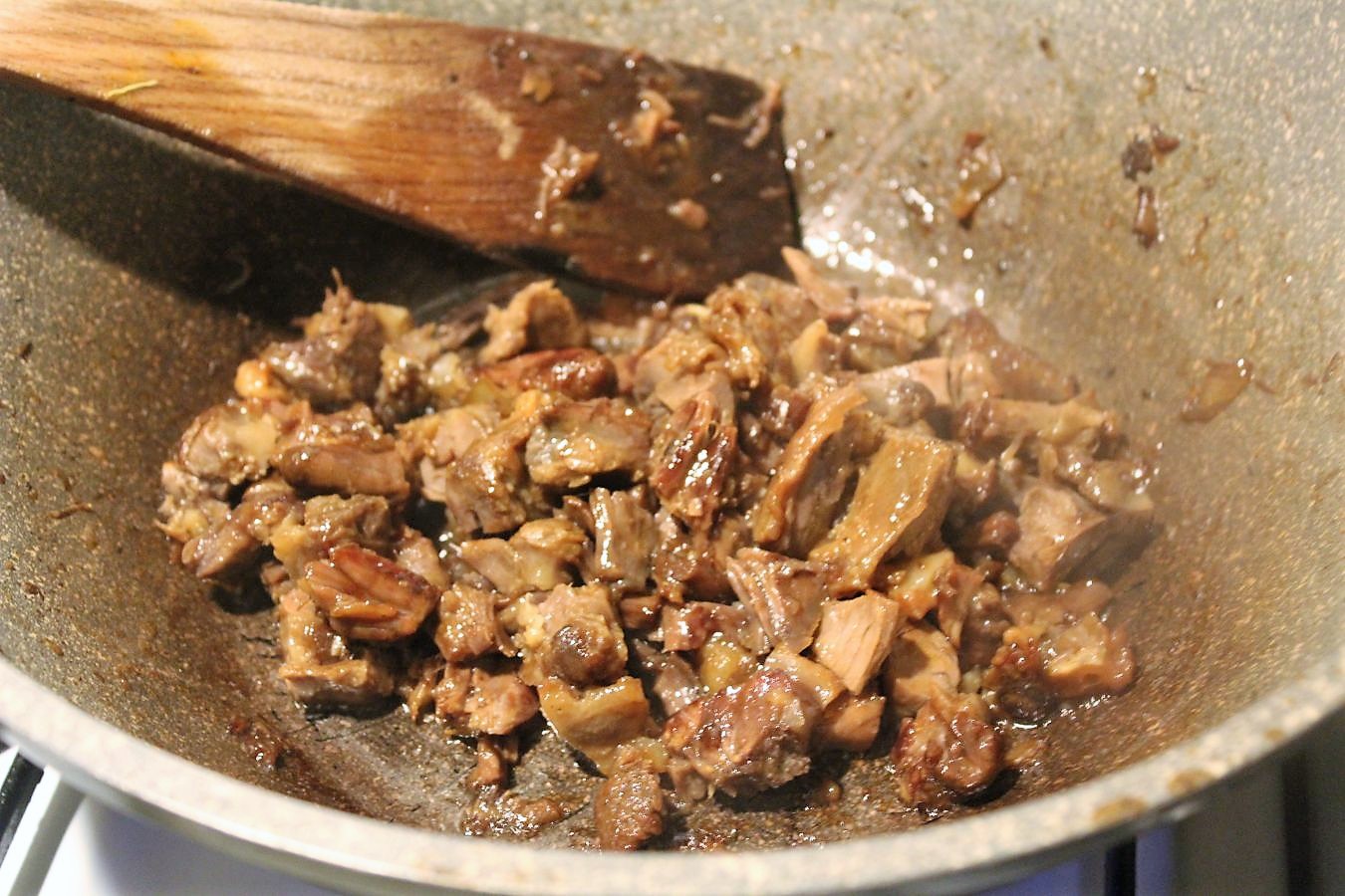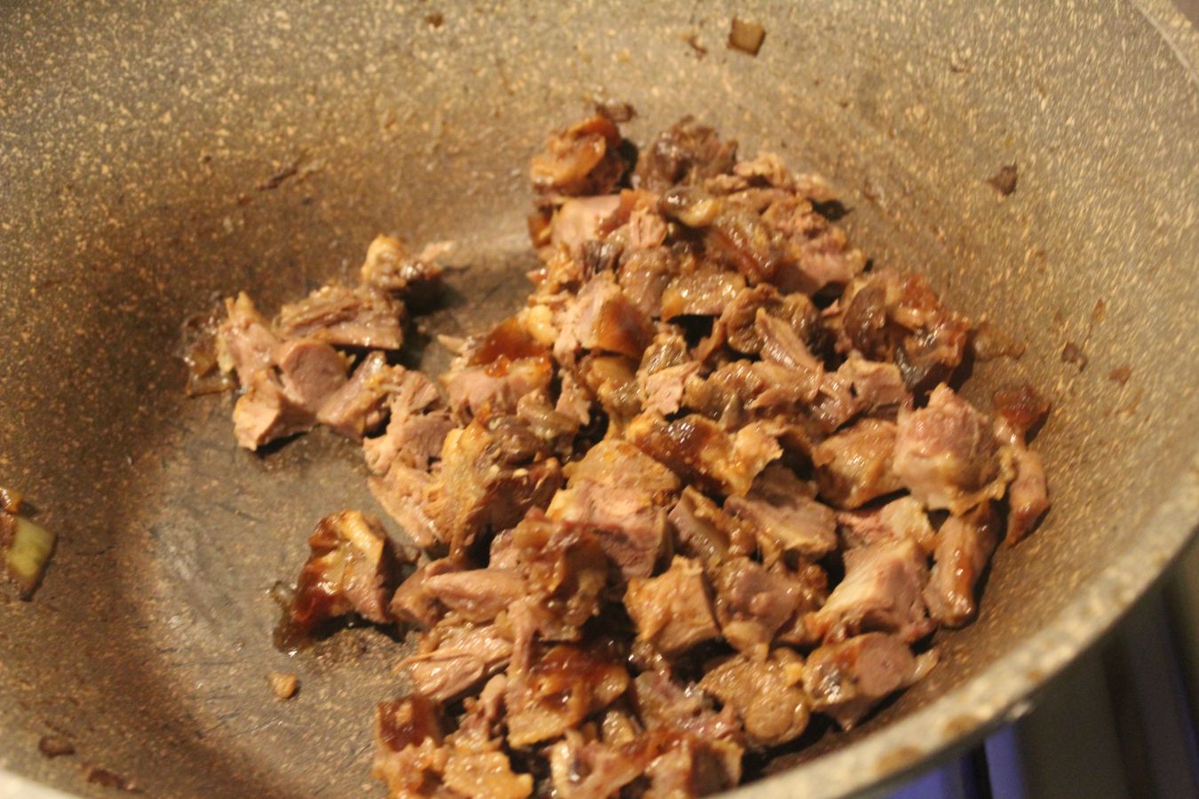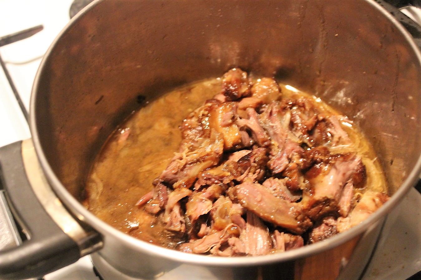 Das ist jetzt nur das Eigenfett des Fleisches, da habe ich noch keine eingekochte Flüssigkeit aus dem Topf dazu gegeben.
