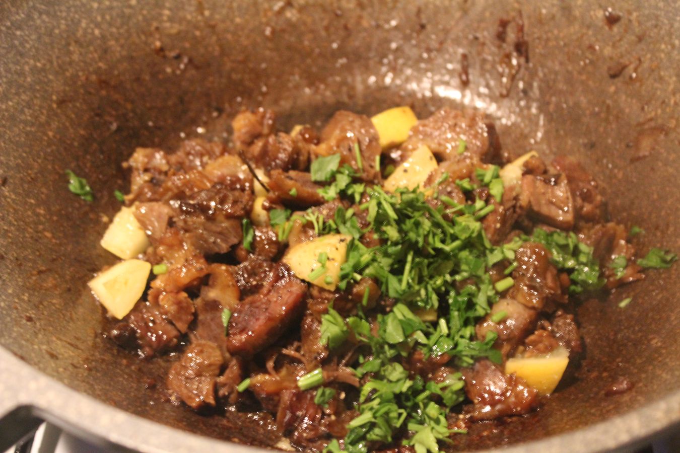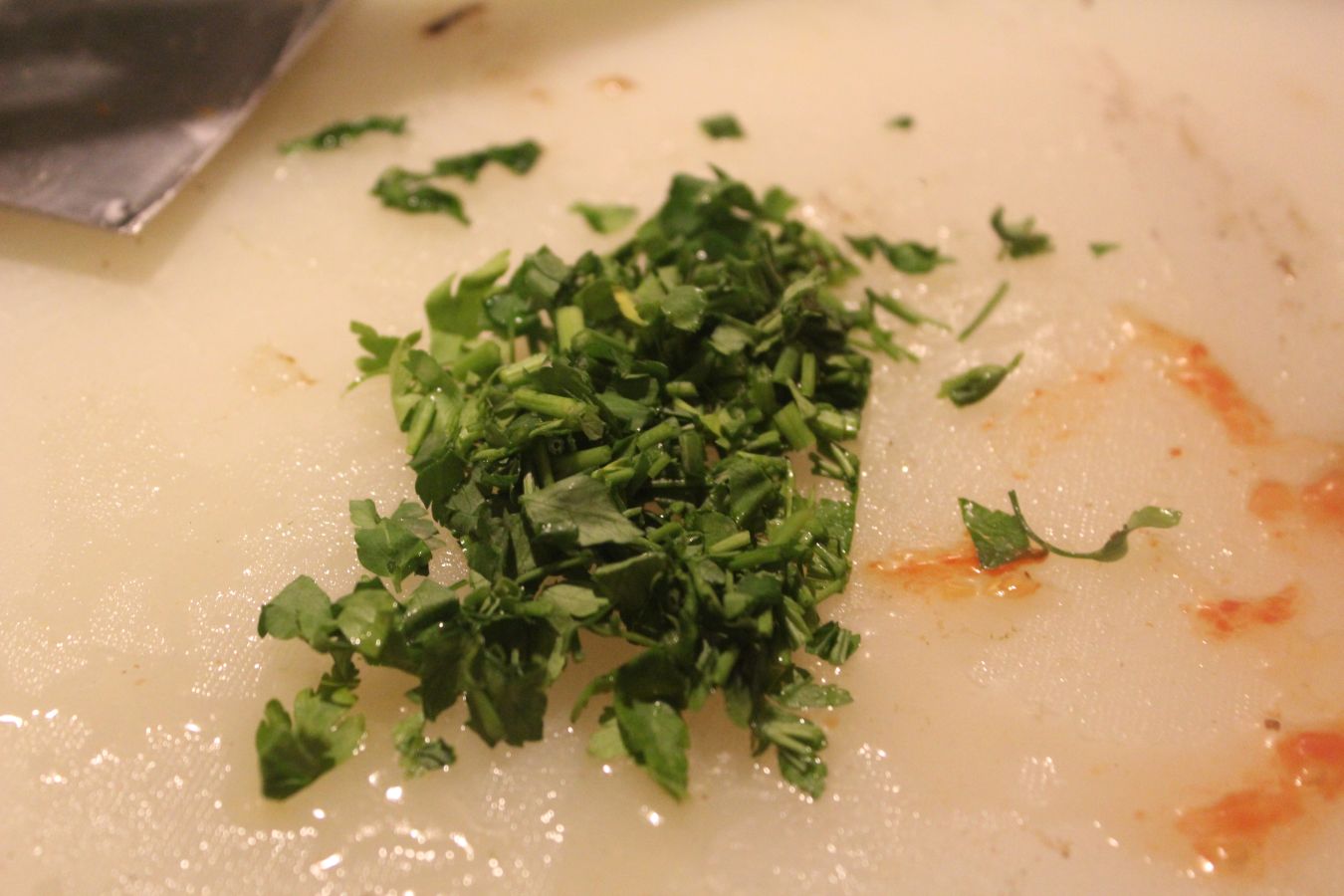 Petersilie hacken, die Flüssigkeit aus dem Topf ebenfalls in den Wok geben.