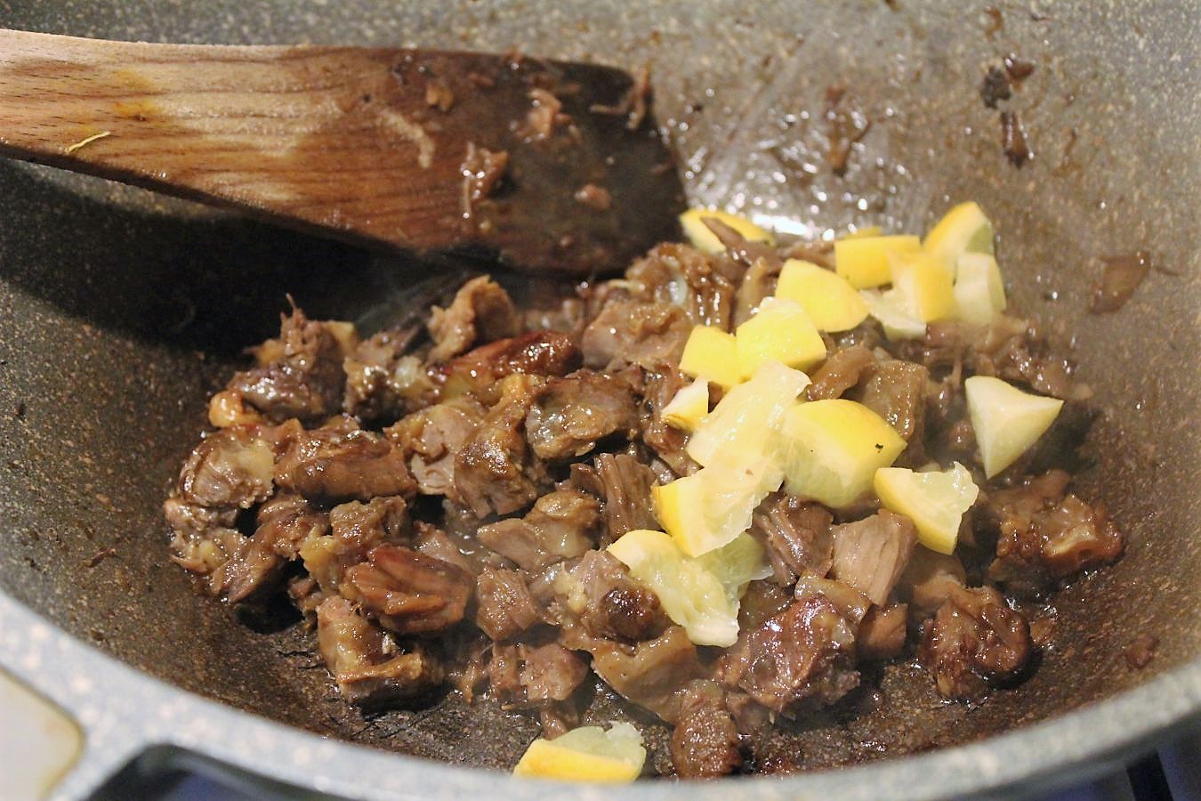 Wenn das Fleisch Röstaromen gebildet hat, kommt die Salzzitrone in den Wok. Nun den Herd auf kleinste Flamme reduzieren.