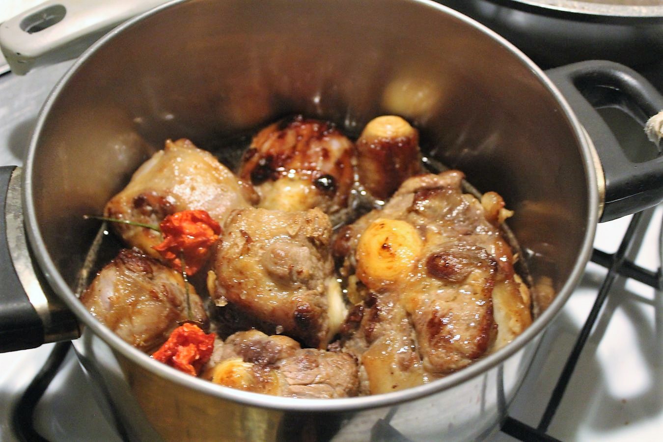Ich brauchte den Wok noch für eine andere Komponente, deswegen ziehe ich jetzt mit dem Ochsenschwanz in einen Topf um. Auf die kleinste Herdplatte umziehen, niedrigste Temperatur einstellen und einen Deckel auf den Topf legen. Alle Stunde ich habe umgerührt. Wer das noch nie gemacht hat, fragt sich vielleicht, warum man das tun sollte. Ganz einfach, im Knochen sitzt eine Menge Geschmack und daraus kocht man normal deftige Brühen, die sich hier aber wieder ins Fleisch reduziert. Das Fleisch wird total zart. Was gibt es geileres zu Essen, als Fleisch, das unter der Gabel zerfällt und auch noch einen durch Knochen gepimptes Aroma hat, zu einem Preis den sich jeder leisten kann?