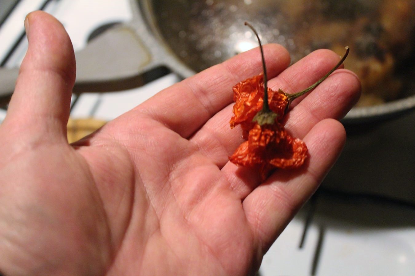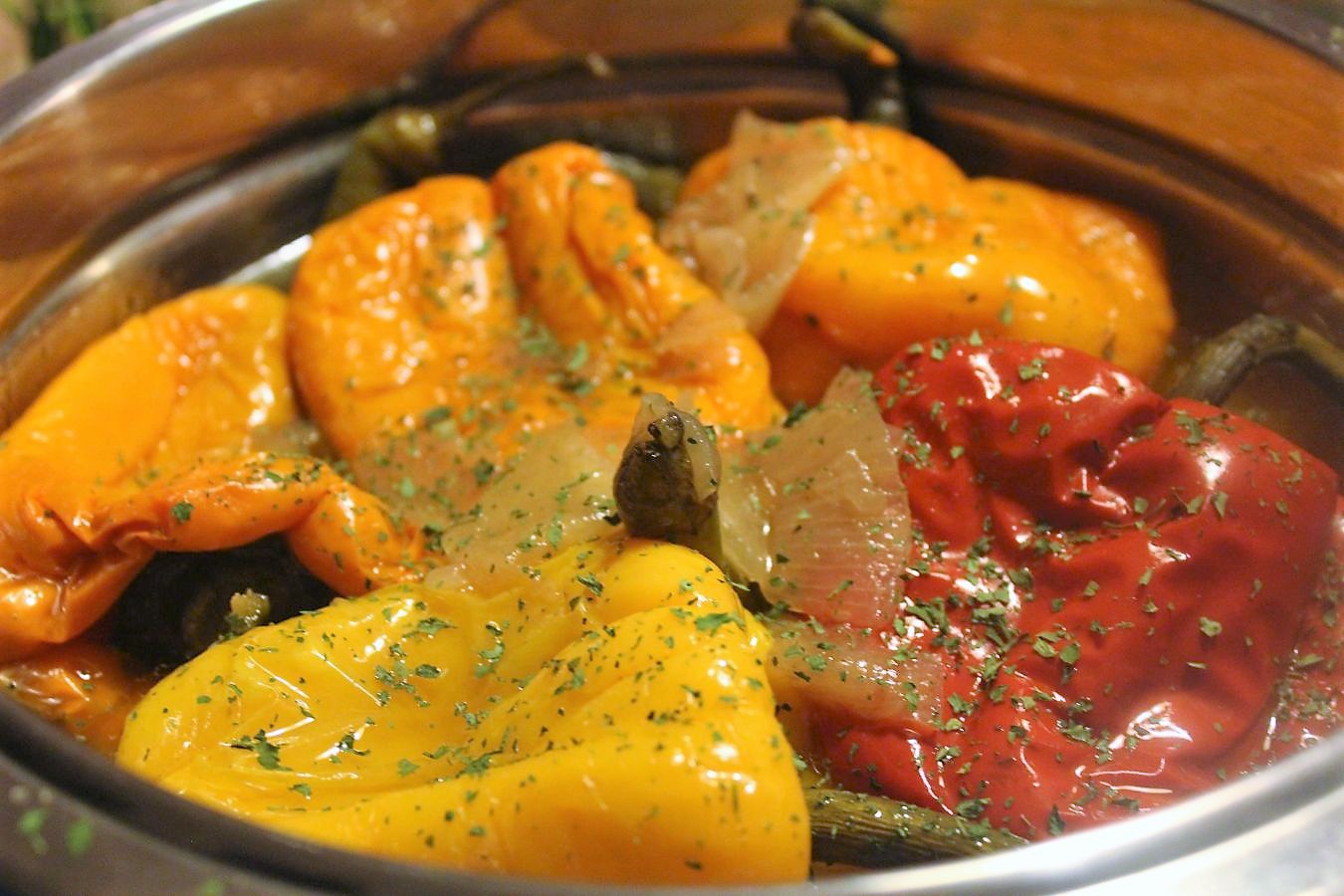 Um sich das besser vorstellen zu können. Dazu gibt es süßsauer geschmorte Paprika